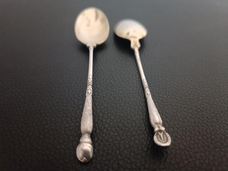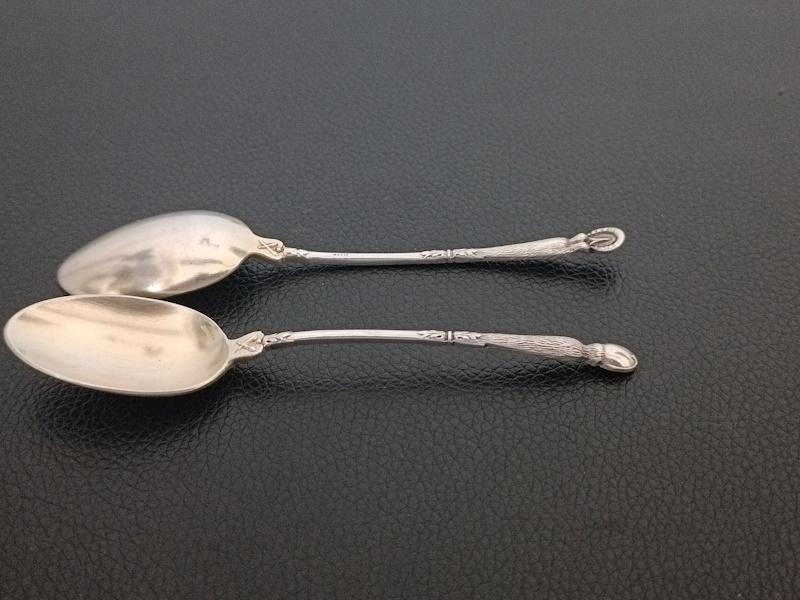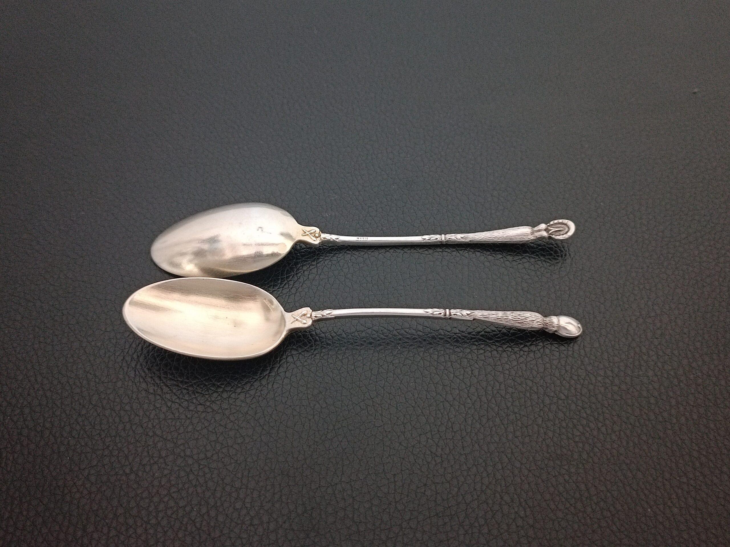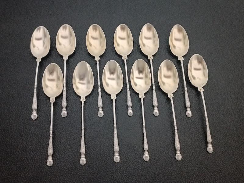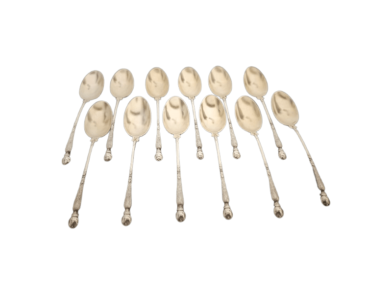 Ensemble de 12 cuillères à moka en métal argenté manches à la russe à décor végétal, cuillerons dorés. Poinçon d’orfèvrerie Durousseau-Raynaud (1857-1938).