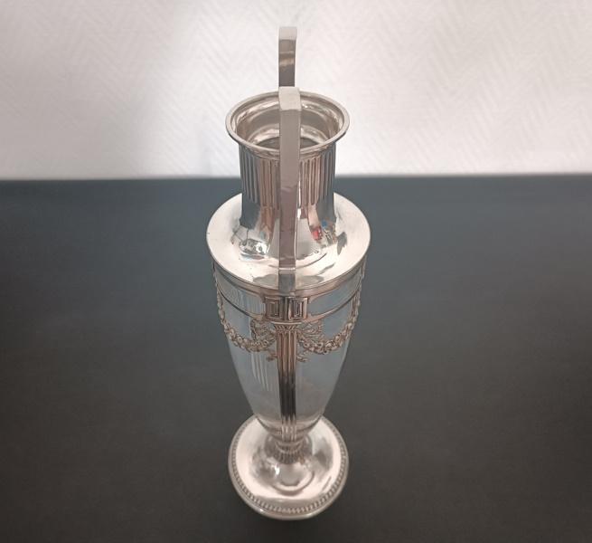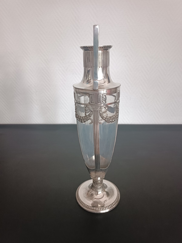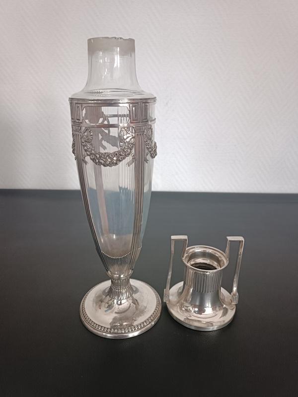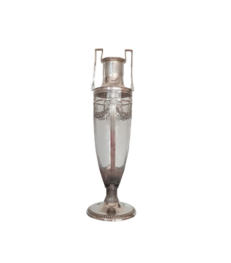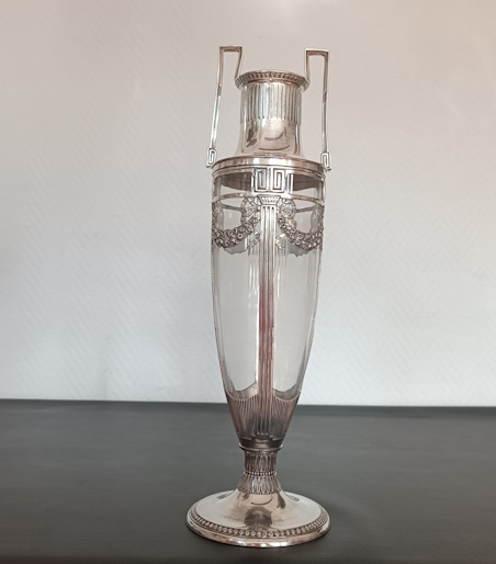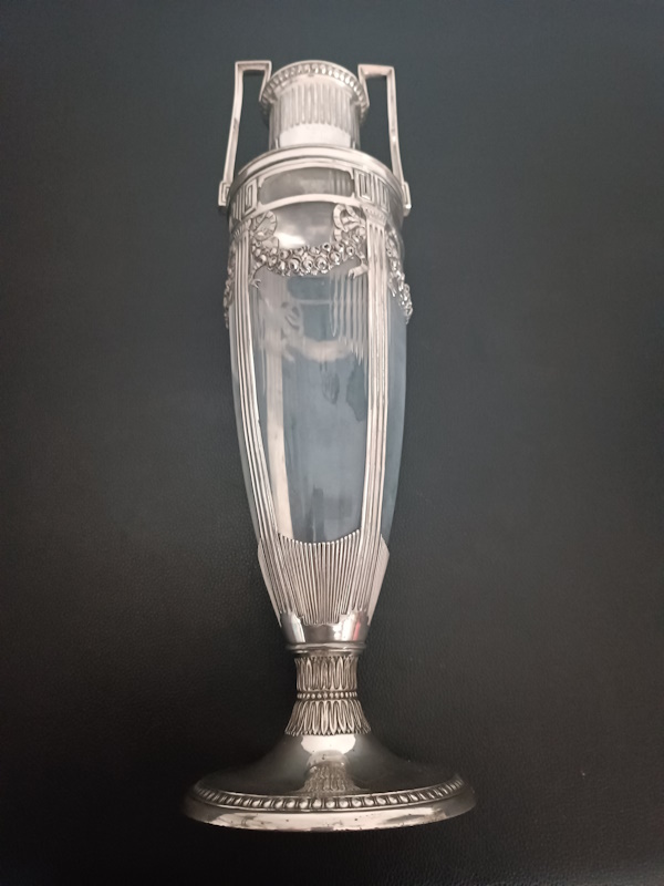 Vase Art Nouveau en métal argenté en forme d’amphore orné de guirlandes florales, de noeuds de rubans noués, anses et monture d’inspiration Grecque, pied à rang de perles.