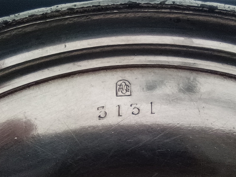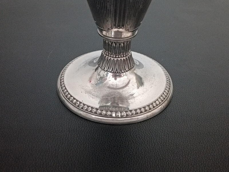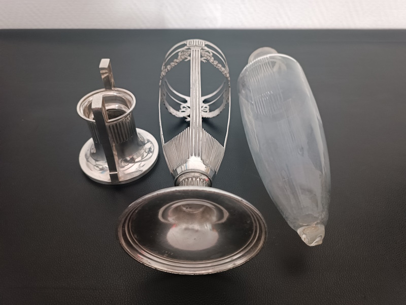 Verrine enchâssée dans la monture représentant des colonnes cannelées. Poinçon de la manufacture Allemande Orivit (1898-1914) AOG. En bon état, quelques rayures d’usage. Hauteur 40cm x Bases Ø12cm-Poids total 1kg175