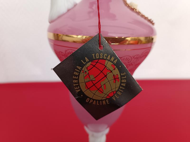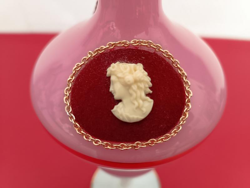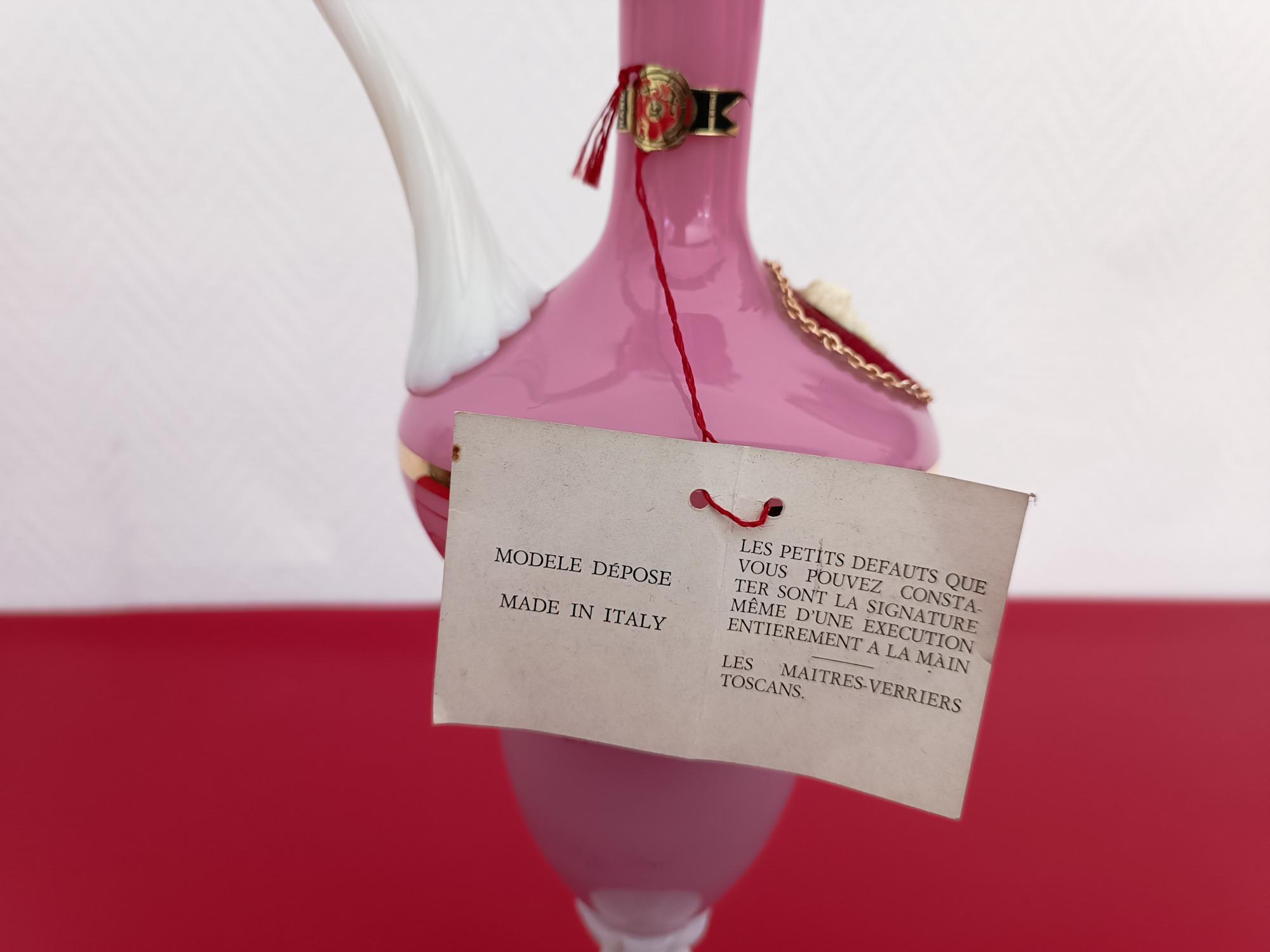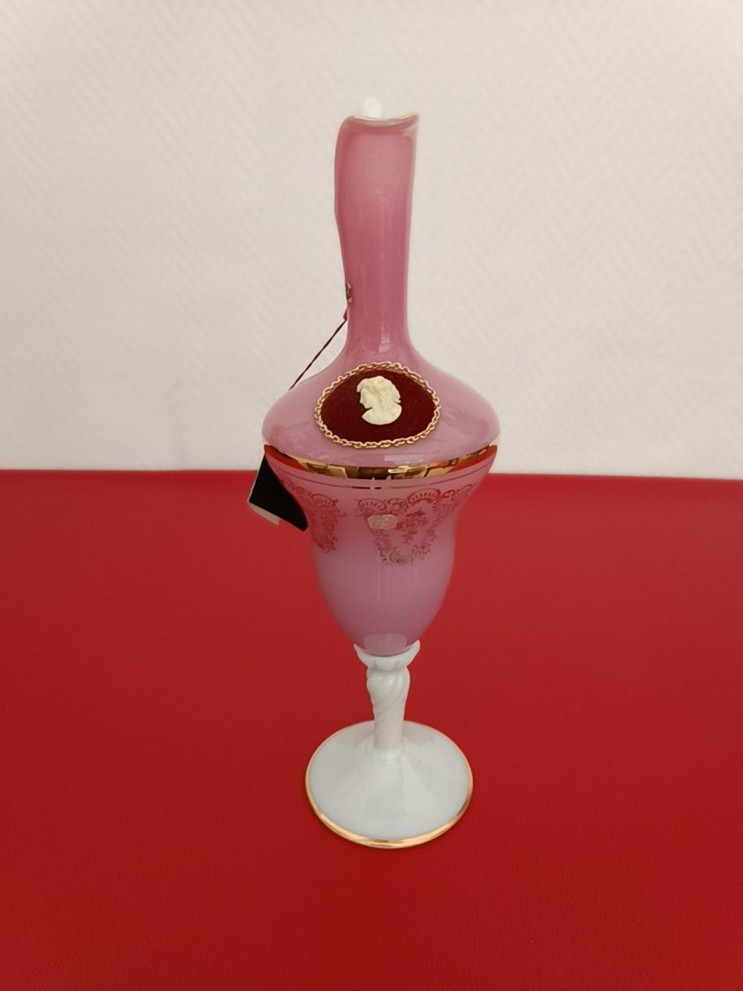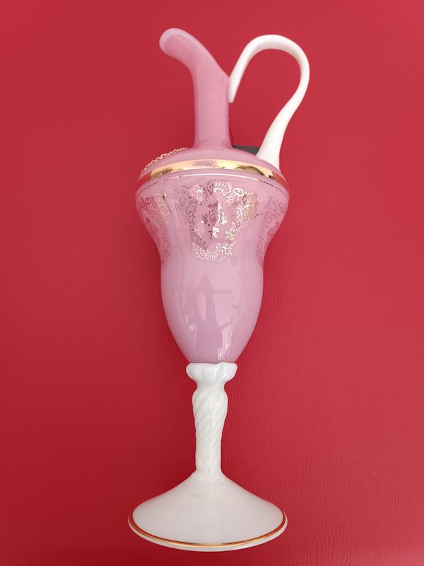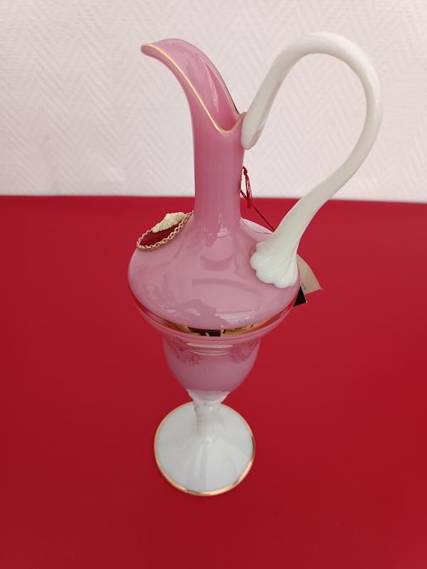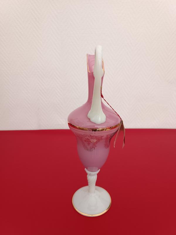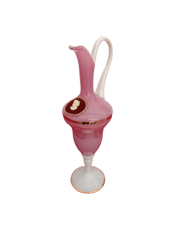 Aiguière en opaline de Toscane faite à la main, anse et pied torsadés en verre blanc, panse de couleur rose à dorures décorée d’un camée dans médaillon en feutrine rouge.