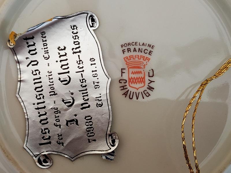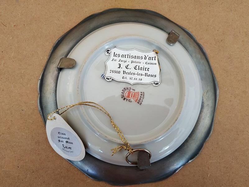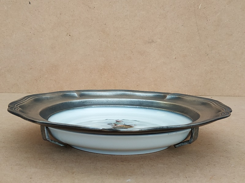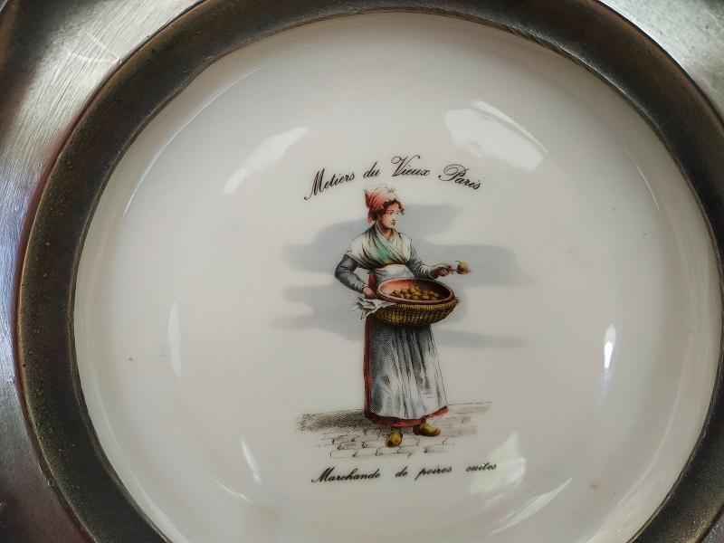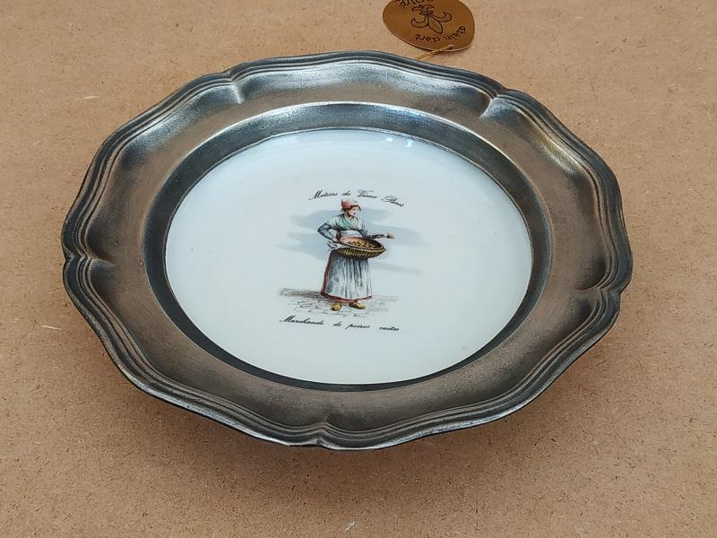 Assiette en porcelaine de Chauvigny « Les métiers du vieux Paris » représentant une marchande de poires cuites, dans un cerclage en étain d’Art fait main. En bon état, diamètre 18cm, poids 370g.