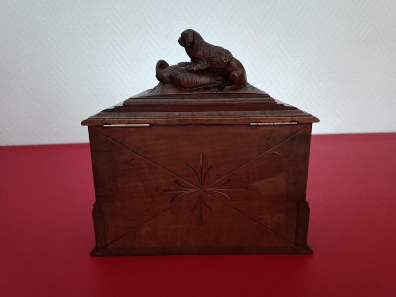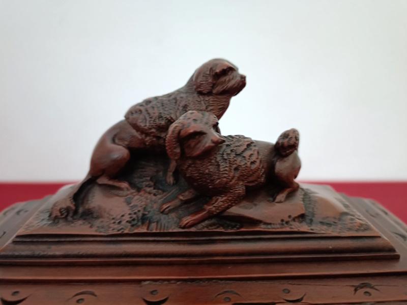 Boite à bijoux en bois sculpté à décor de feuilles de chêne , prise représentant deux chiens montant la garde dans le goût Forêt Noire fin XIXème siècle. Intérieur à 4 compartiments carrés pivotants capitonnés de soie turquoise laissant apparaitre un dernier rangement rectangulaire.