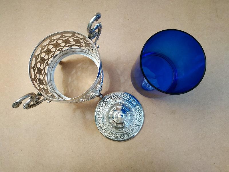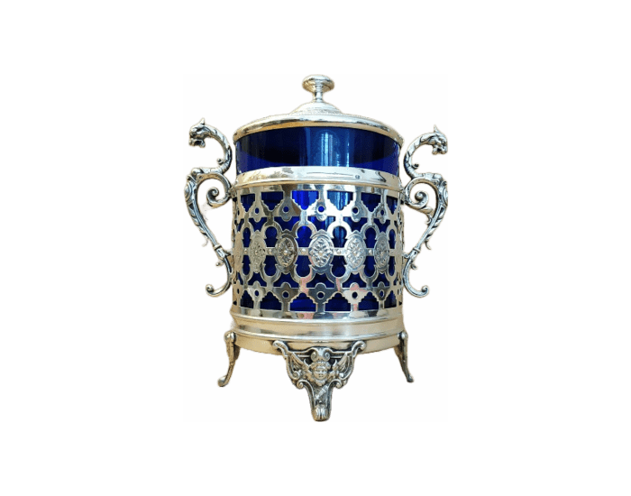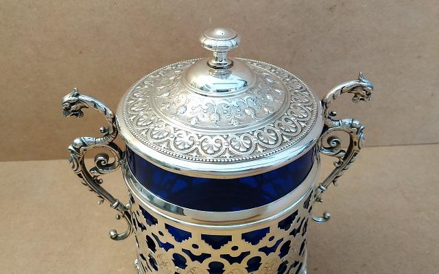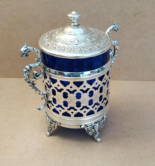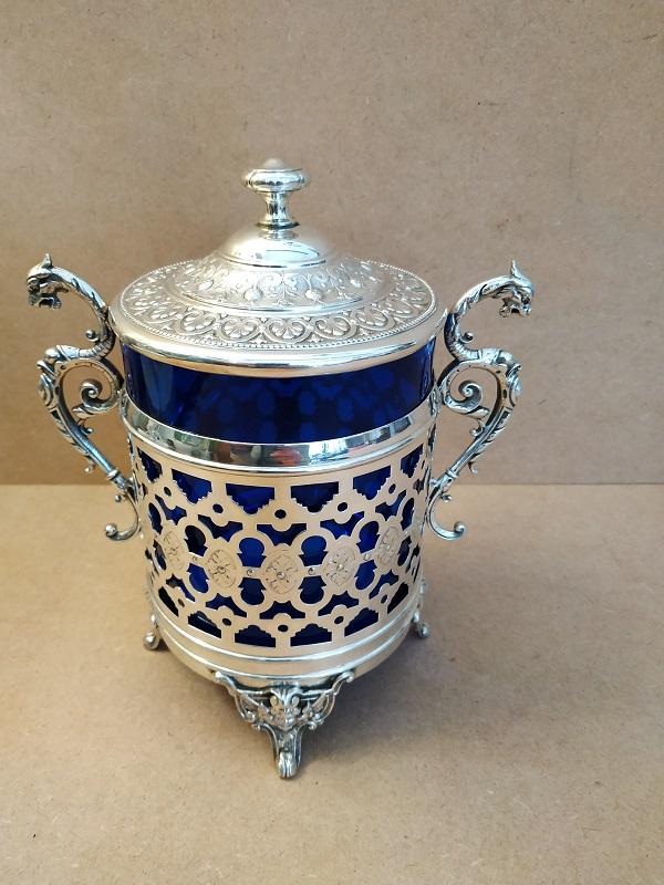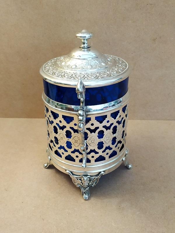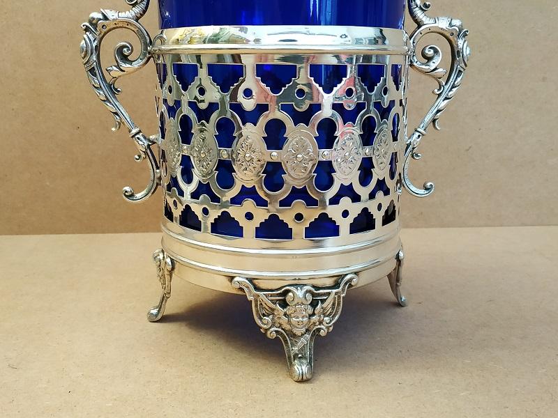 Boite à biscuits monture en métal argenté sur 4 pieds à décor d’ange,carquois et arc, prises en forme de griffon et verre bleu en parfait état. Poinçon WMM manufacture Allemande. En bon état (petites traces d’usage), dimensions: H22 x L19 x Ø11cm poids 850g.