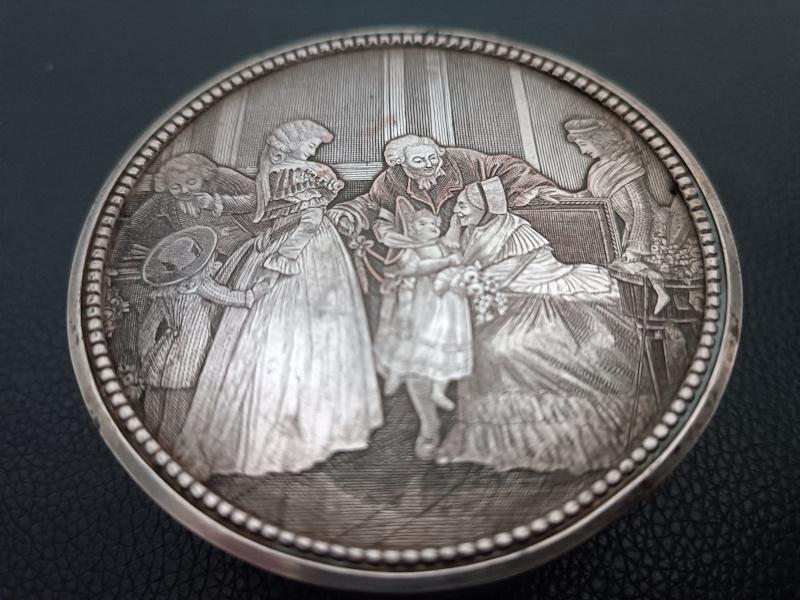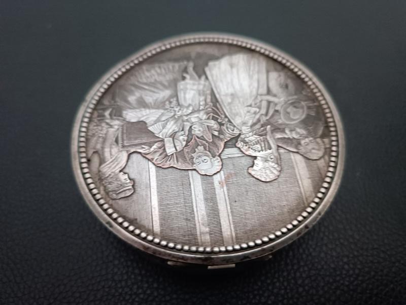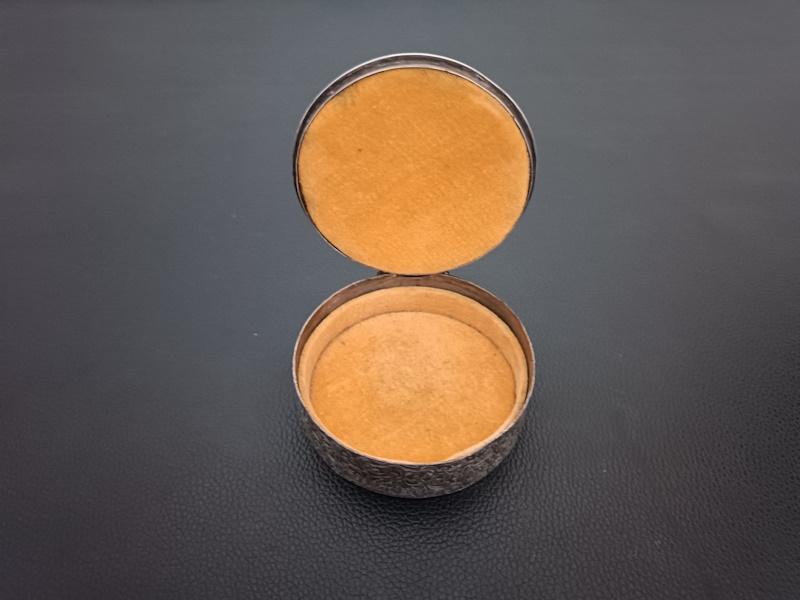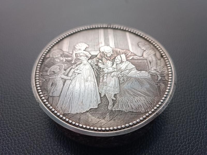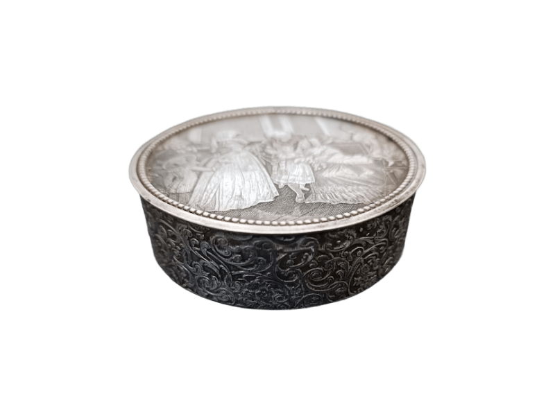 Boite à bijoux en cuivre argenté couvercle à décor de scène de salon cerclé d’un rang de perles, pourtours ornés d’arabesques, intérieur capitonné.