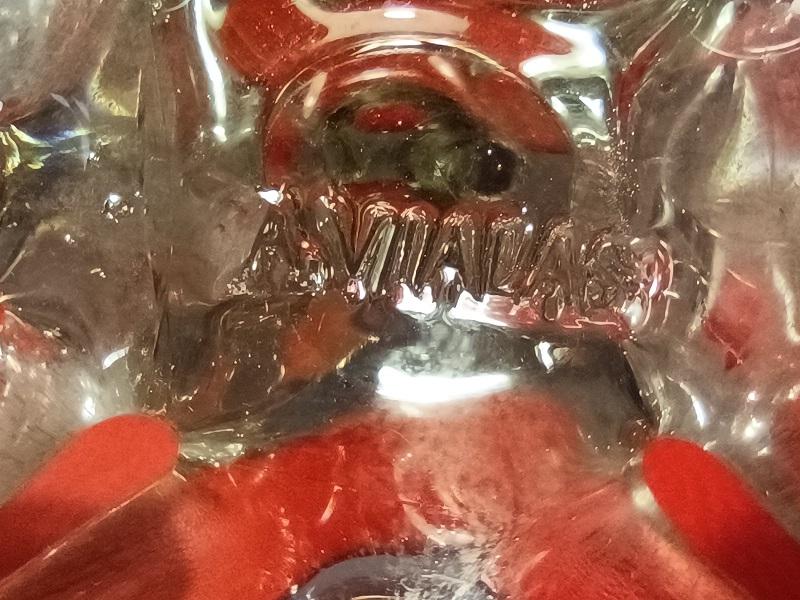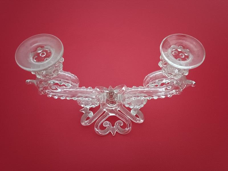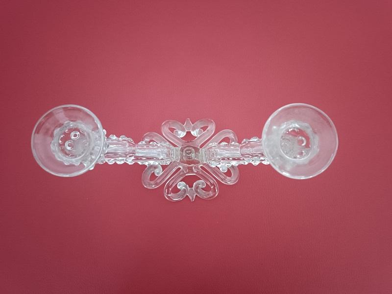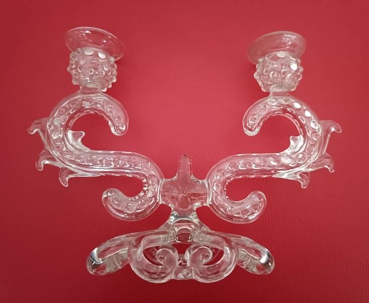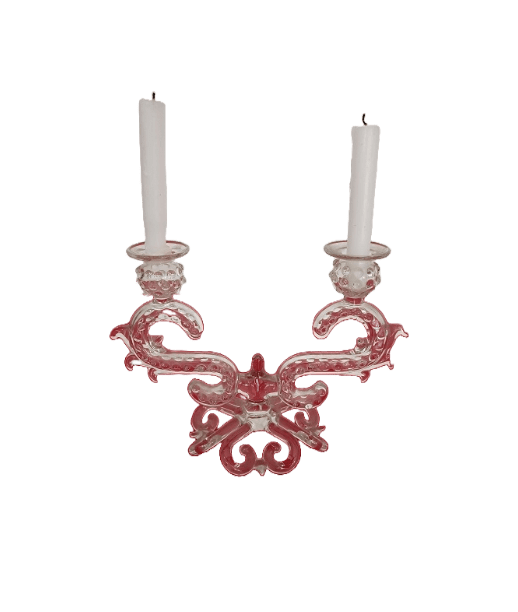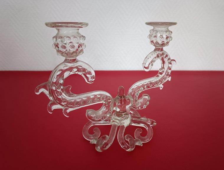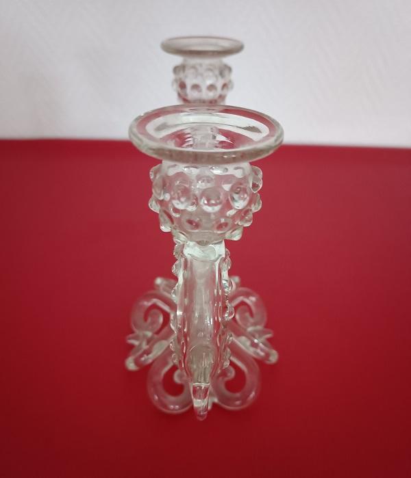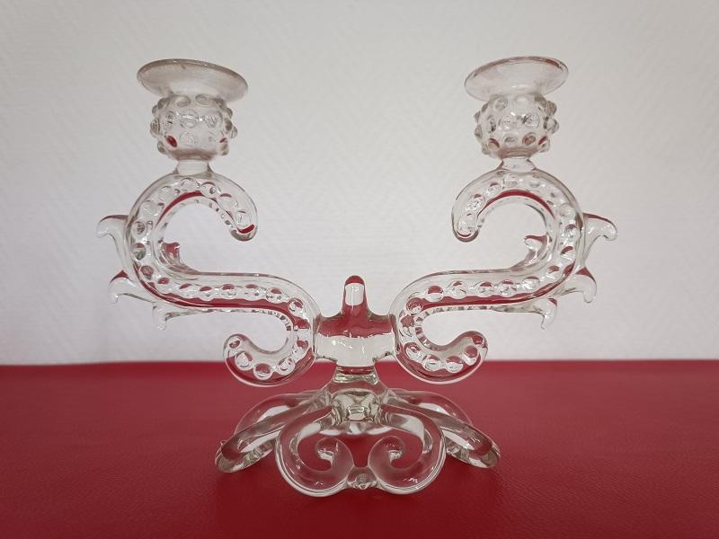Bougeoir en verre à deux branches en forme de « S », pied stylisé à 4 cœurs, design des années 50-60 dans le goût de Venise. Signature en creux dans la pâte A.Vialas sous le socle.
