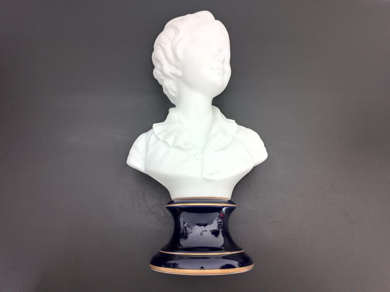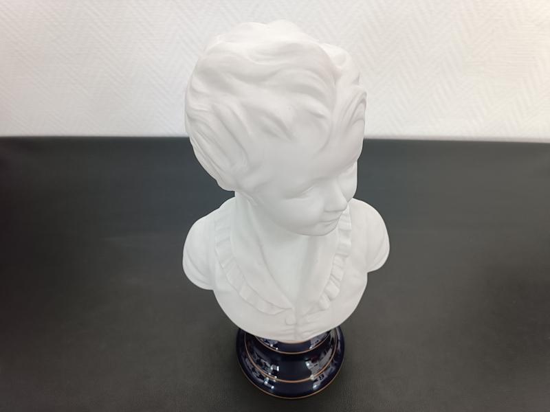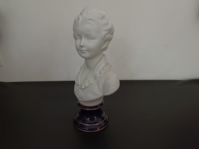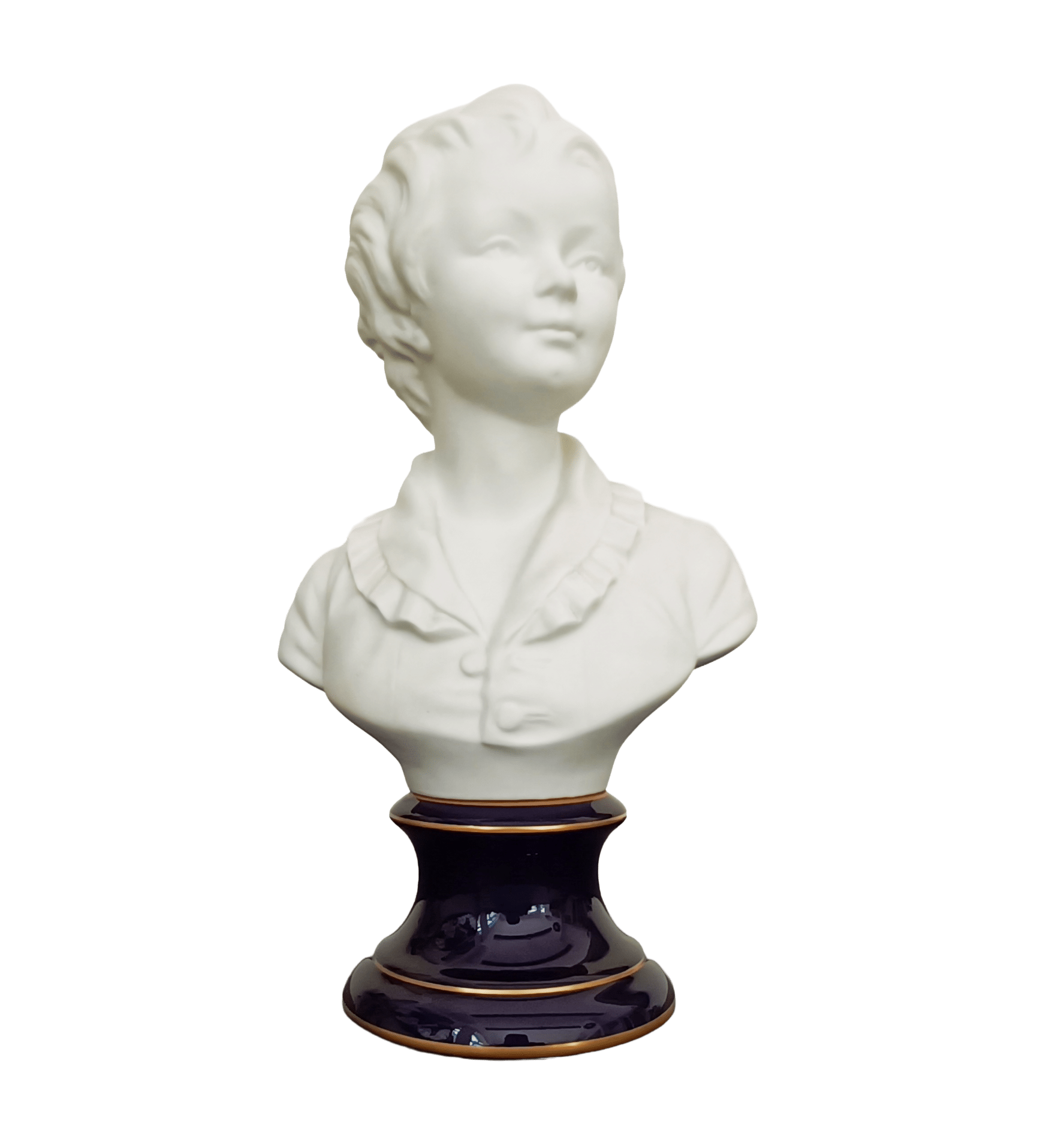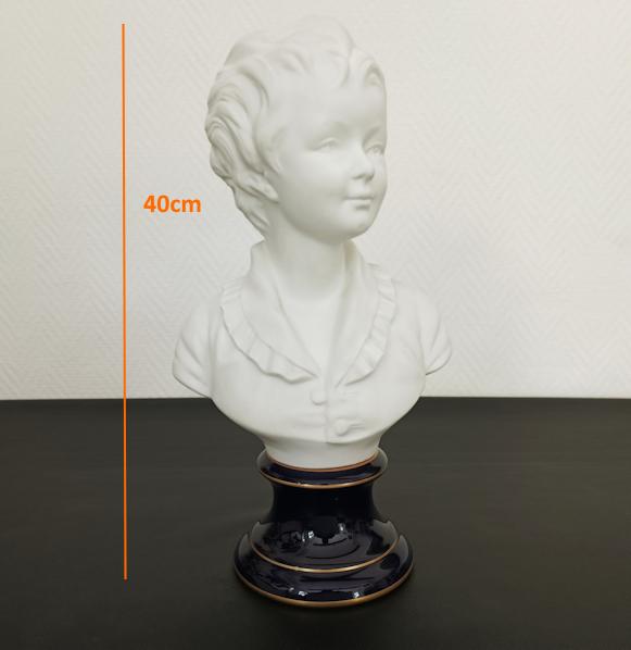 Buste en biscuit représentant un jeune enfant, socle en porcelaine bleu de four. Marqué sous la base Goumot-Labesse Limoges France.