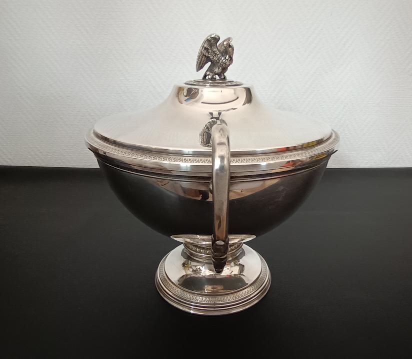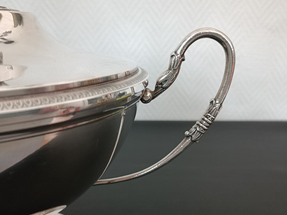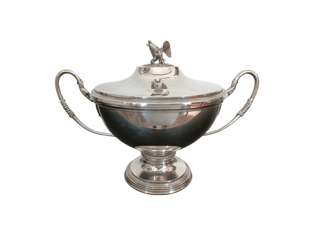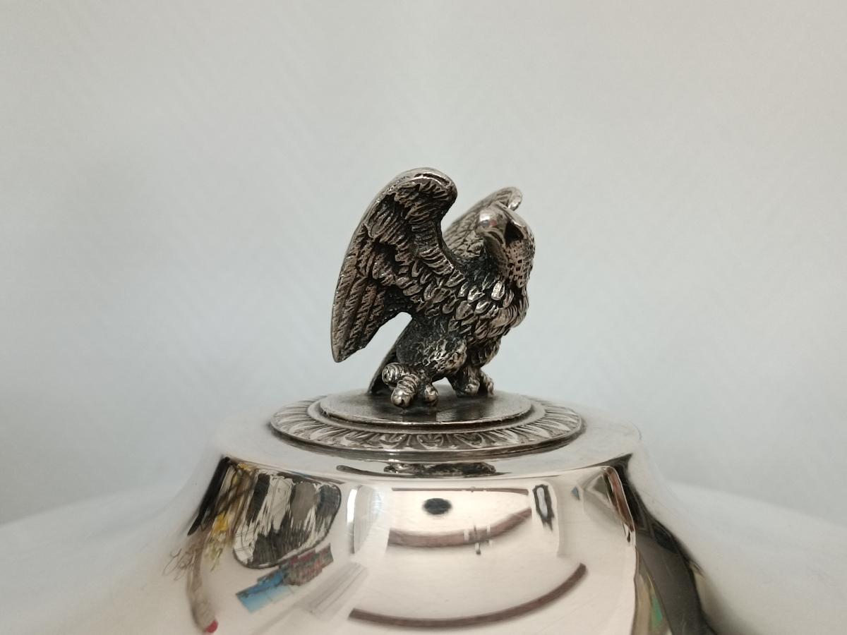 Centre de table en métal argenté sur piédouche à décor de frises de feuilles d’eau, prise en forme d’aigle, anses à col de cygnes de style Empire.