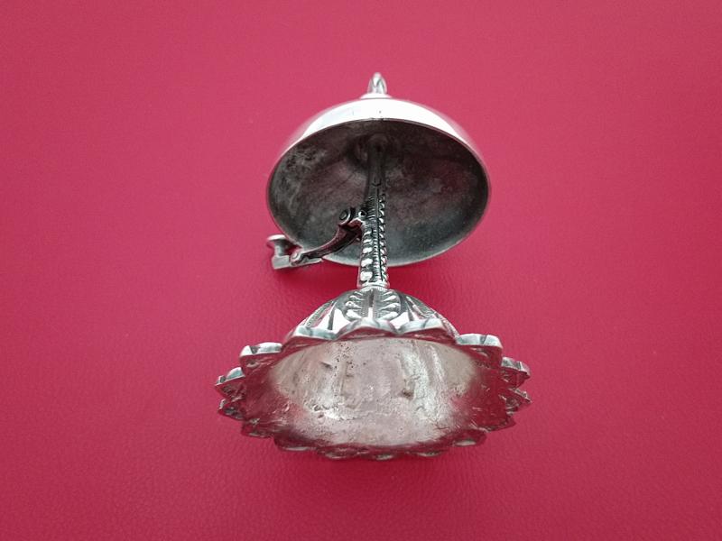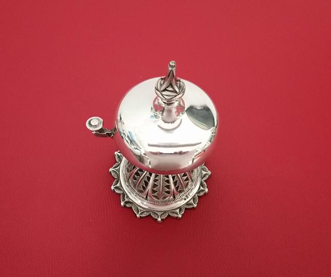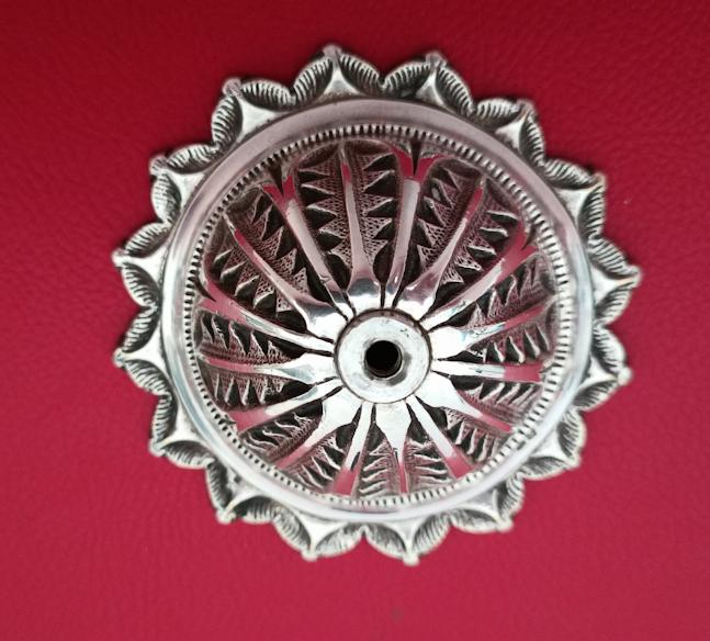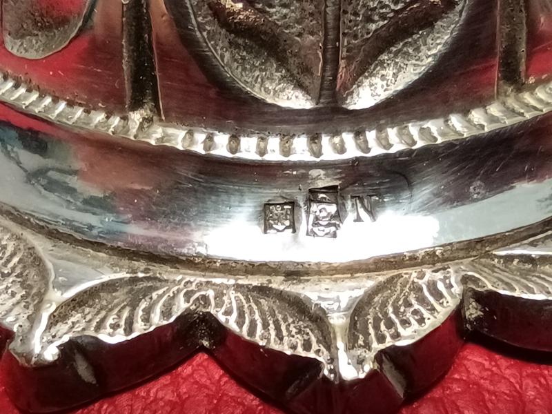 Timbre de comptoir en métal argenté la base en forme de rosace et la prise sont finement ciselées à décor végétal stylisé. Poinçon du maître orfèvre Armand Frenais à Paris AF avec une ancre au centre (1877-1927).