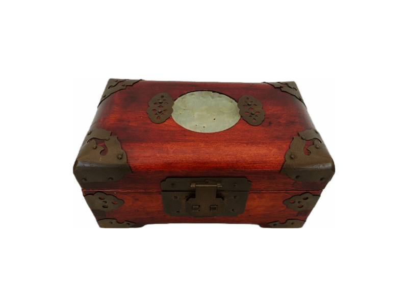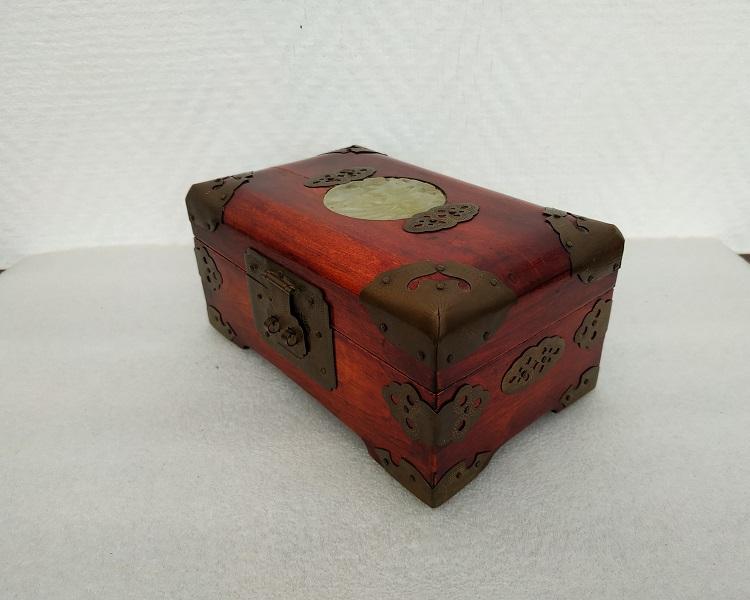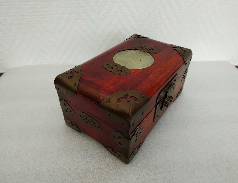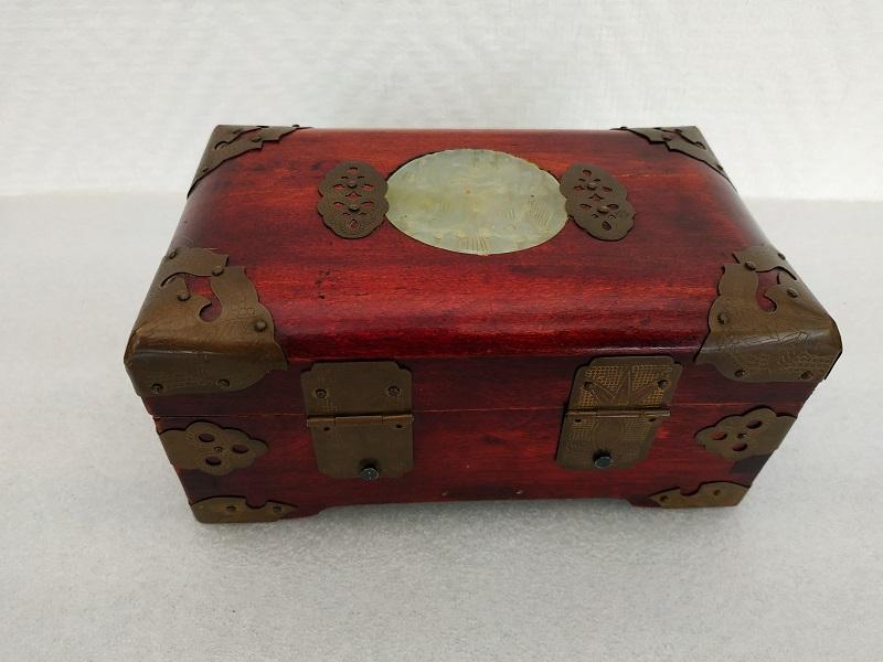Boite à bijoux de forme rectangulaire en bois et pièces de laiton ajustées et clouées, sur le couvercle un médaillon de jadéite, intérieur à plusieurs compartiments recouvert de tissu rouge. En bon état général, traces d’usures du temps. Dimensions: L16,5 x P10 x H7,5cm Poids : 435g