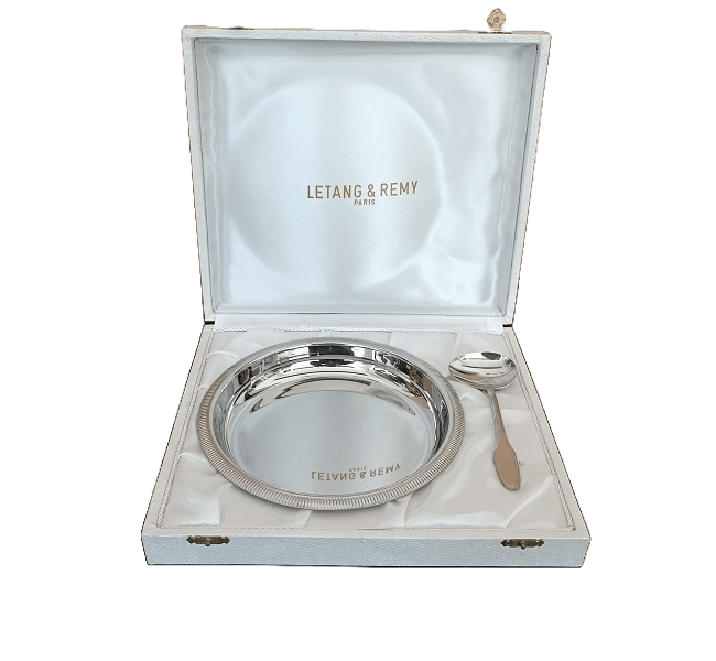 Coffret comprenant une assiette à bouillie et cuillère à décor de godrons en inox 18/10 dans leur écrin d’origine de maison Létang & Rémy.
