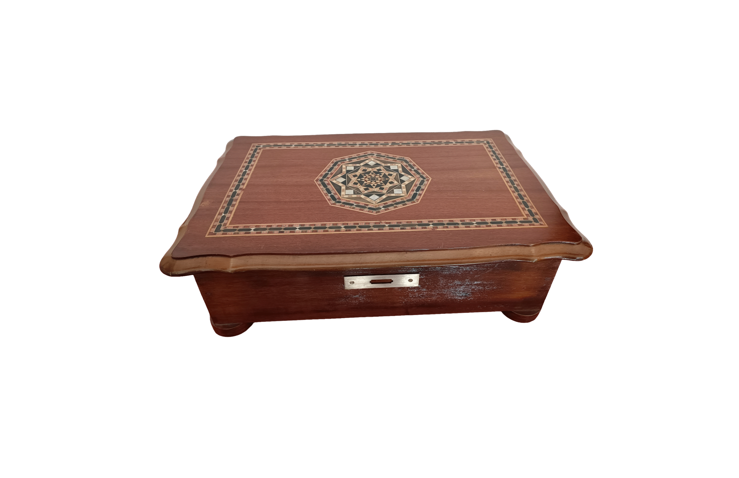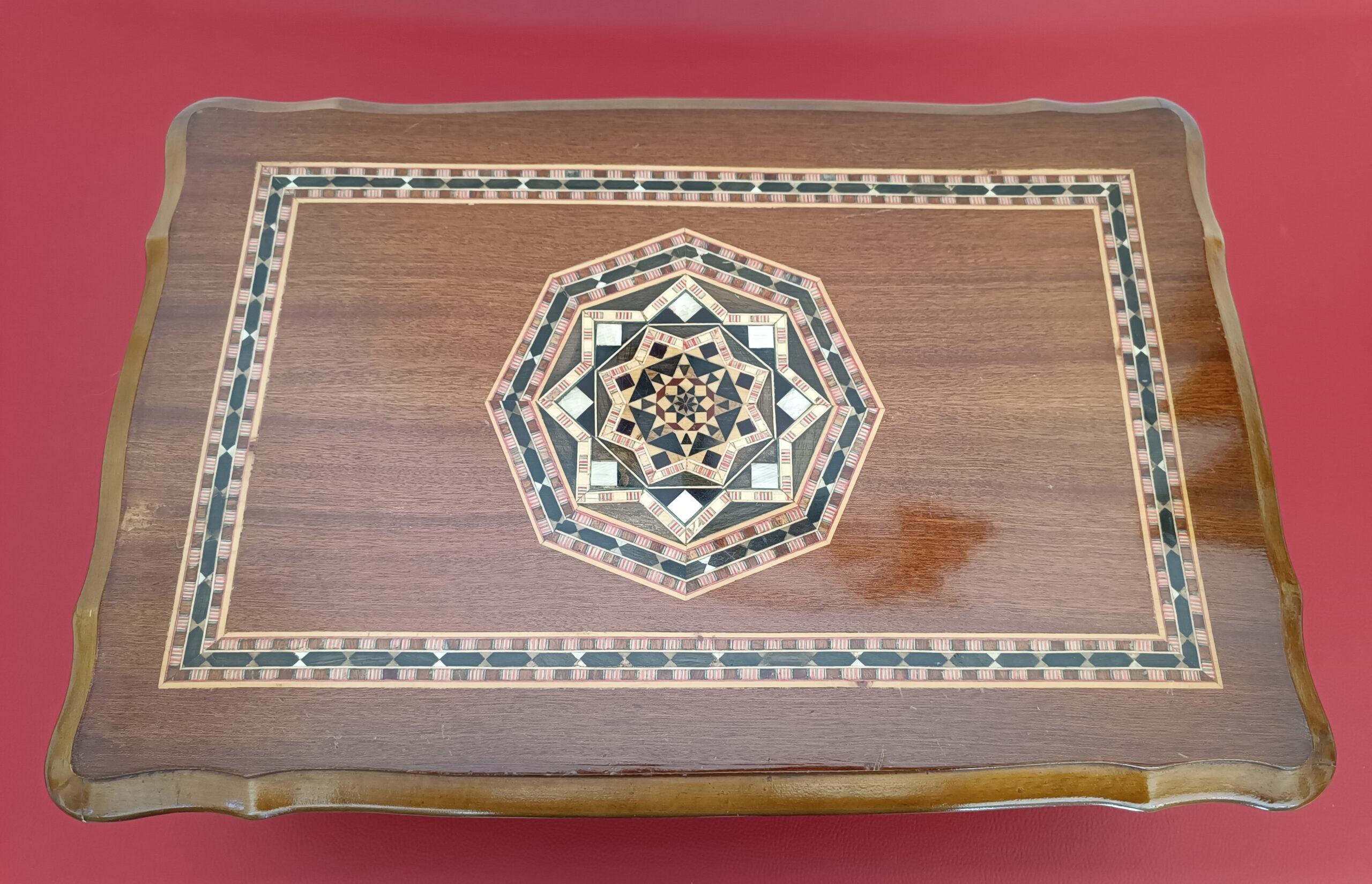 Grand coffret à plateau marqueté décor en forme d’étoile à incrustations de nacre, dans le goût Syrien.