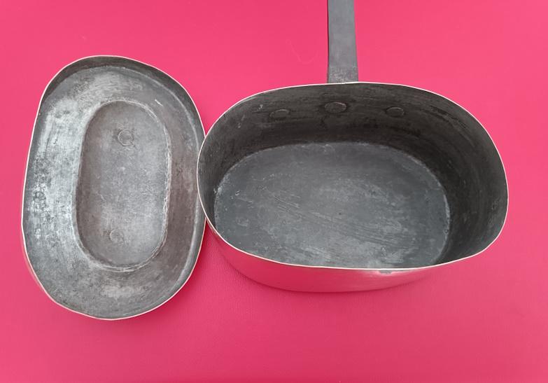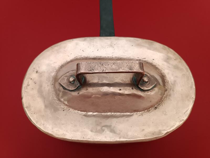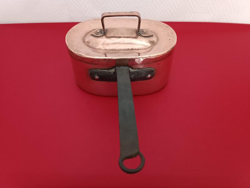 Daubière en cuivre étamé montée en queue de fer forgé montage ancien à créneaux, couvercle à bords roulés avec poignée, d’époque XIXème siècle.