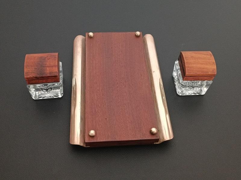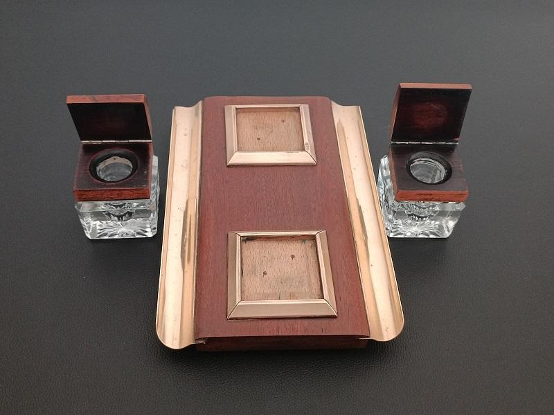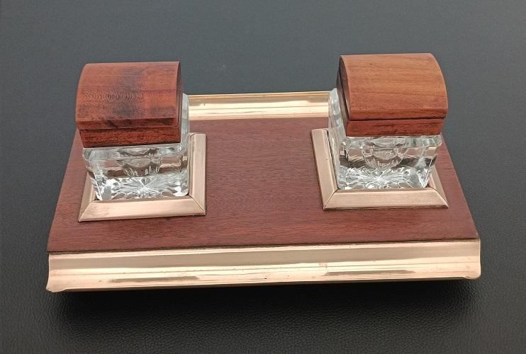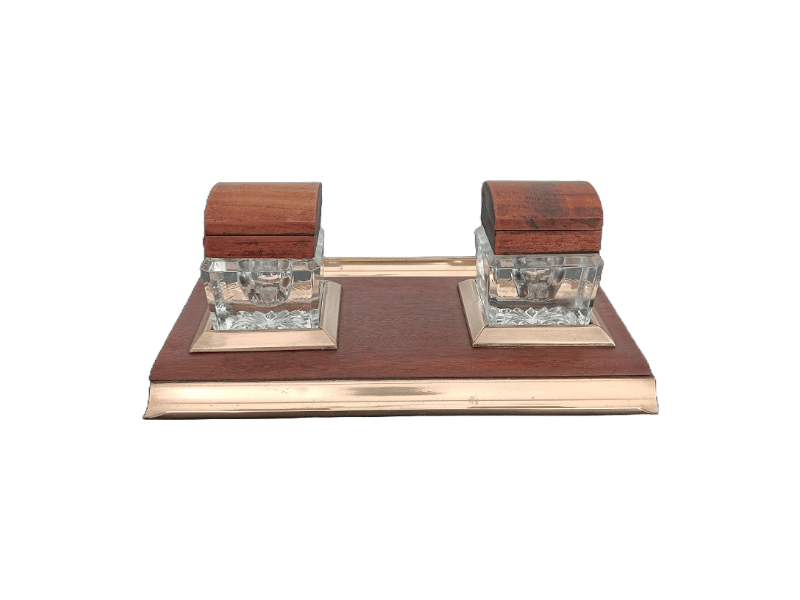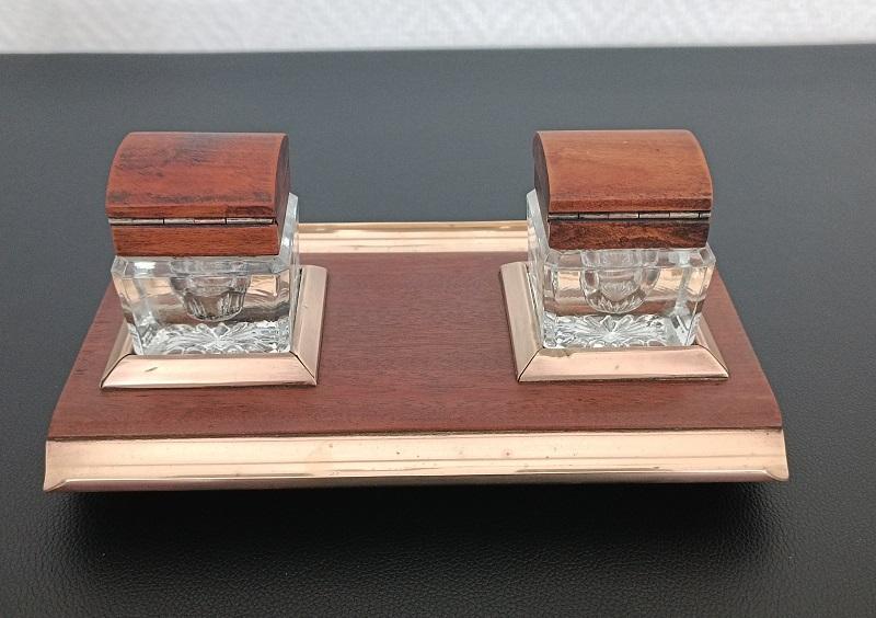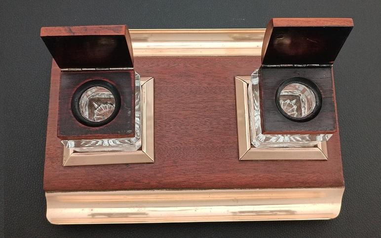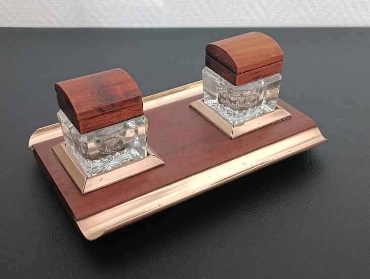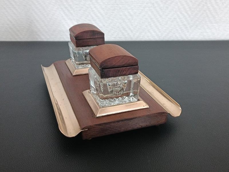 Encrier double réservoirs en bois et laiton