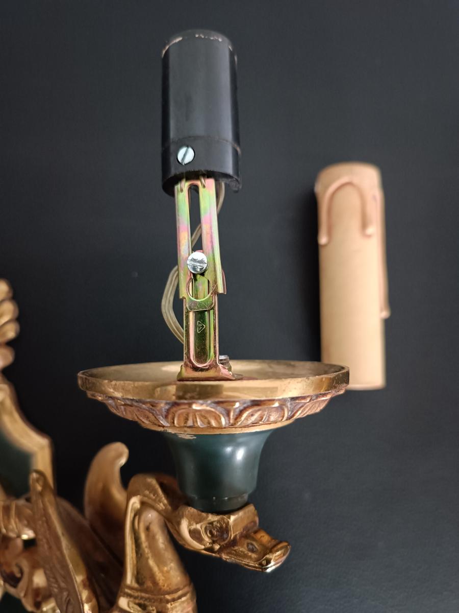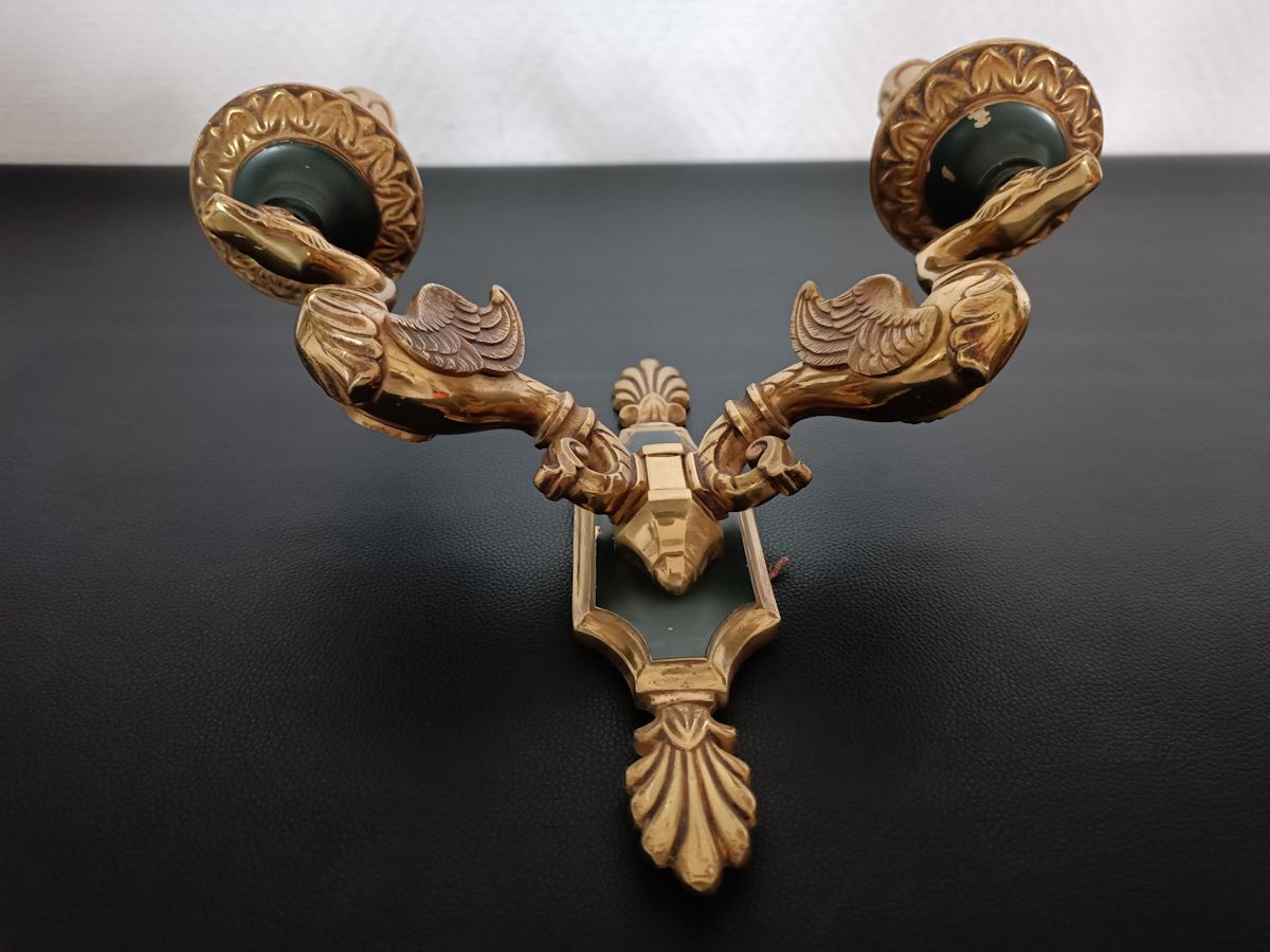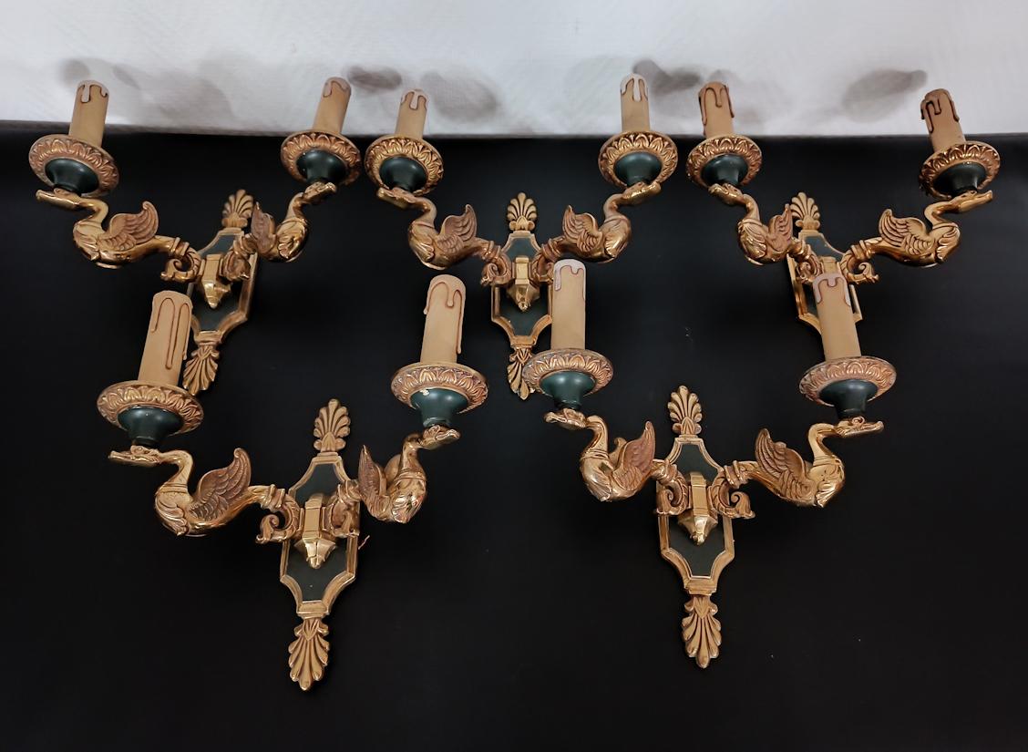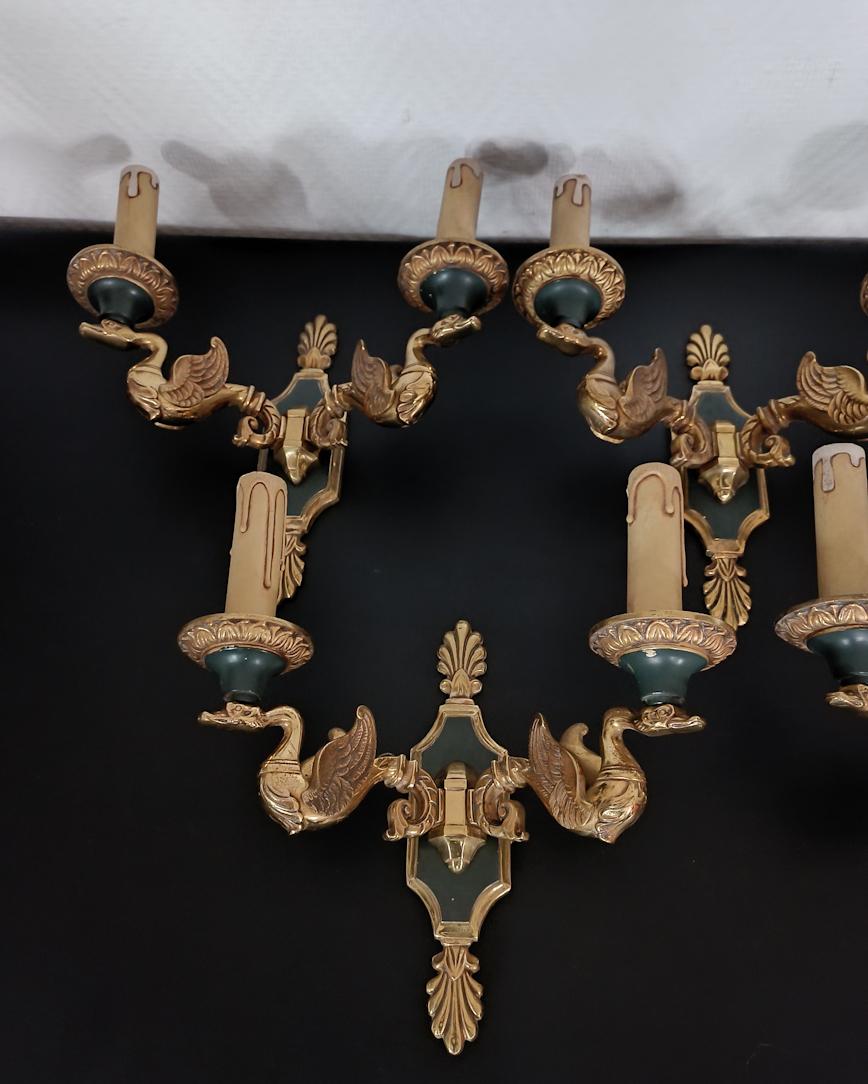 Ensemble de 5 appliques en bronze de style Empire finition doré et vert impérial, bras à deux lumières portées par des cygnes, décors à motifs de feuillages et coquilles stylisées, attribuées à la maison Lucien Gau.