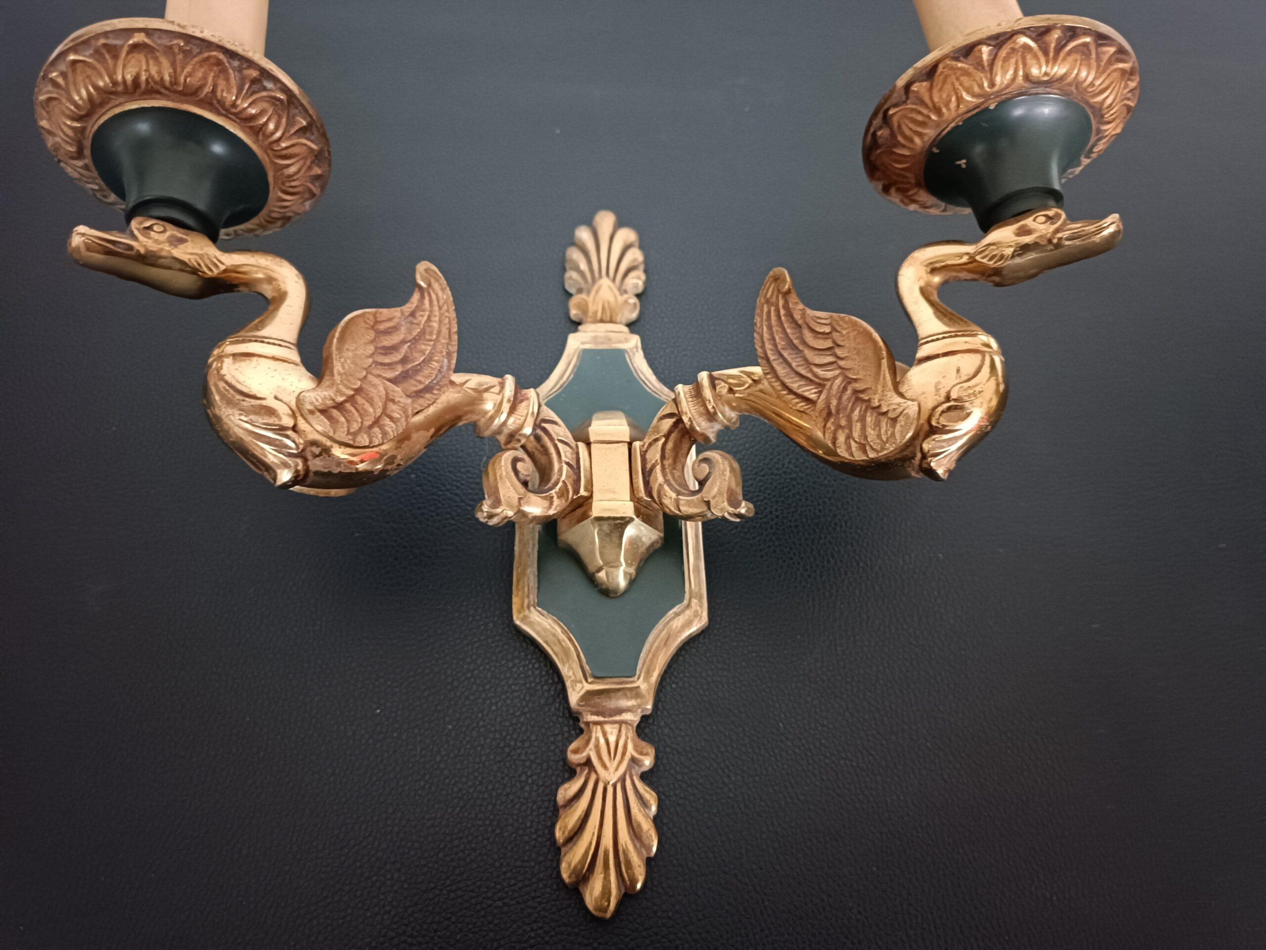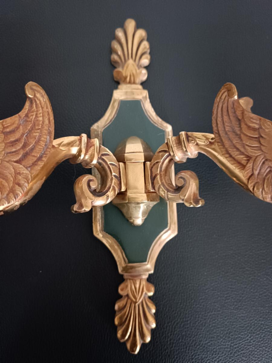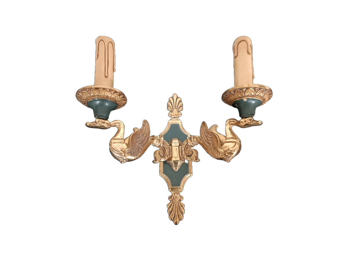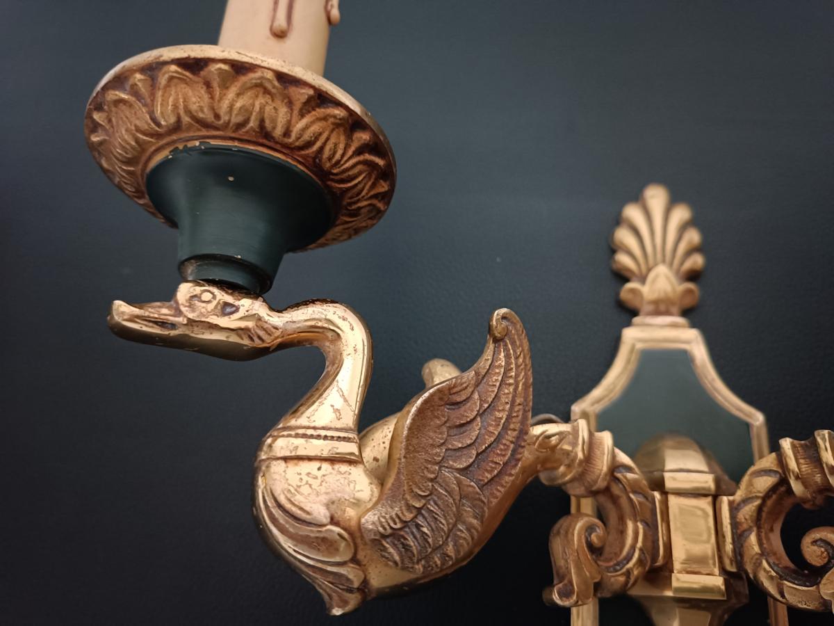 Ensemble de 5 appliques en bronze de style Empire finition doré et vert impérial, bras à deux lumières portées par des cygnes, décors à motifs de feuillages et coquilles stylisées, attribuées à la maison Lucien Gau.