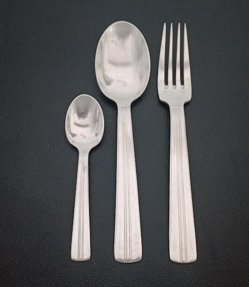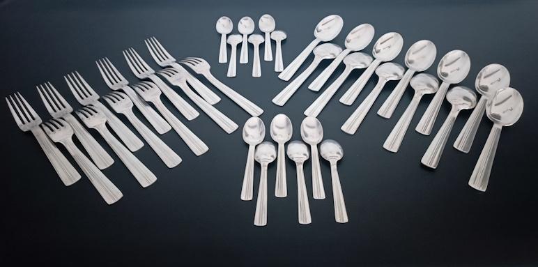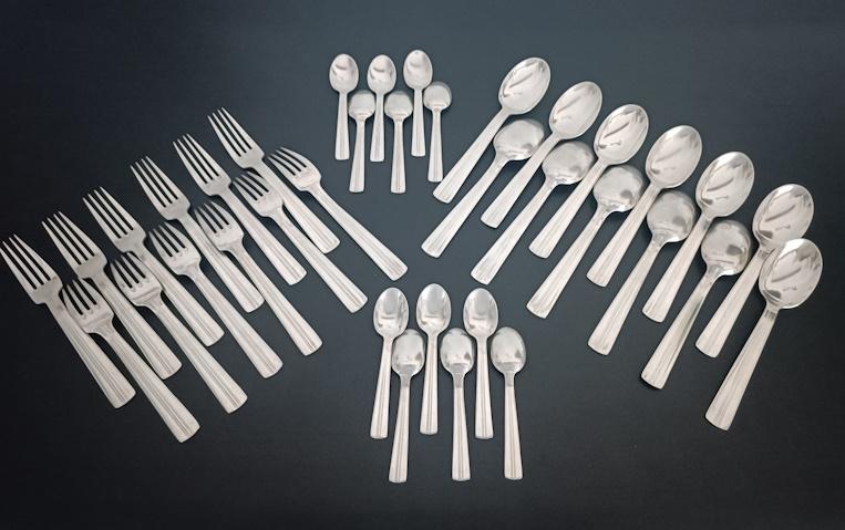 Partie de ménagère Art Déco en métal argenté 36 pièces à décor cannelé composé de 12 cuillères à potage, 12 fourchettes et 12 cuillères à dessert.