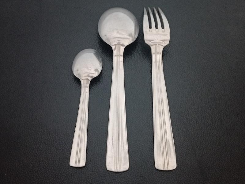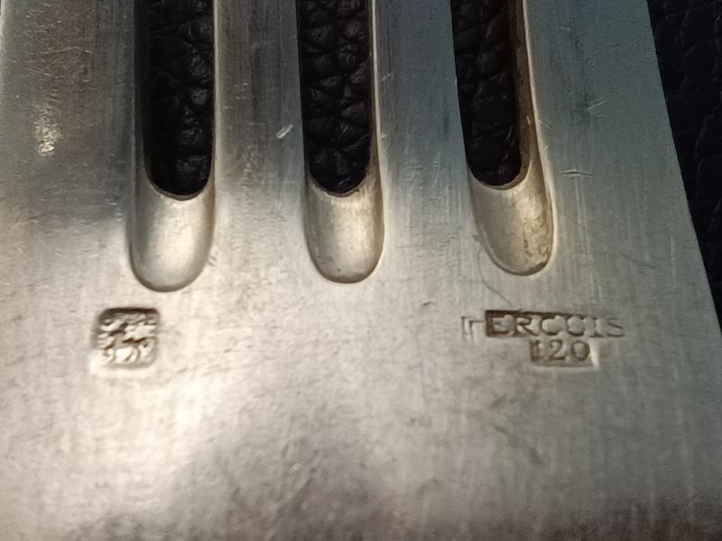 En bon état, légères rayures d’usage. Poinçon d’orfèvrerie Ercuis et 120g. Longueurs couverts 20,5cm cuillères à dessert 13,5cm-Poids total 3kg440.