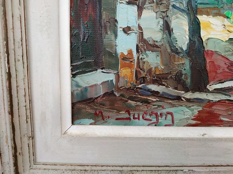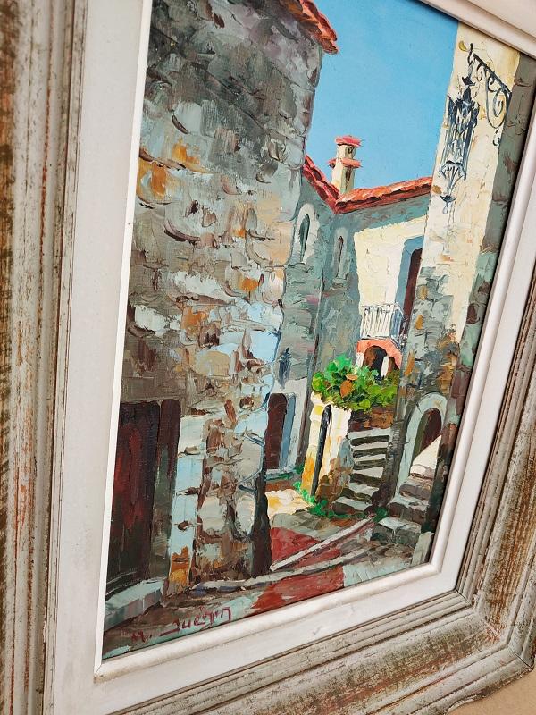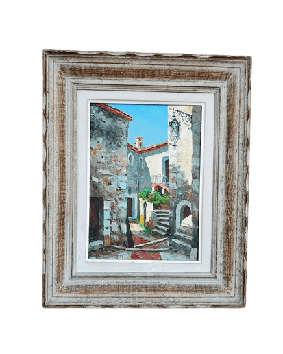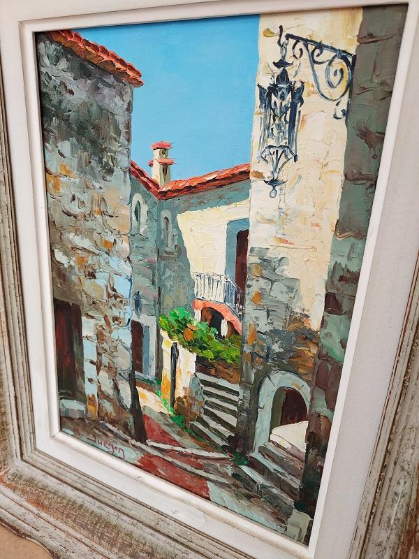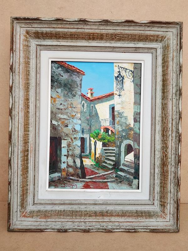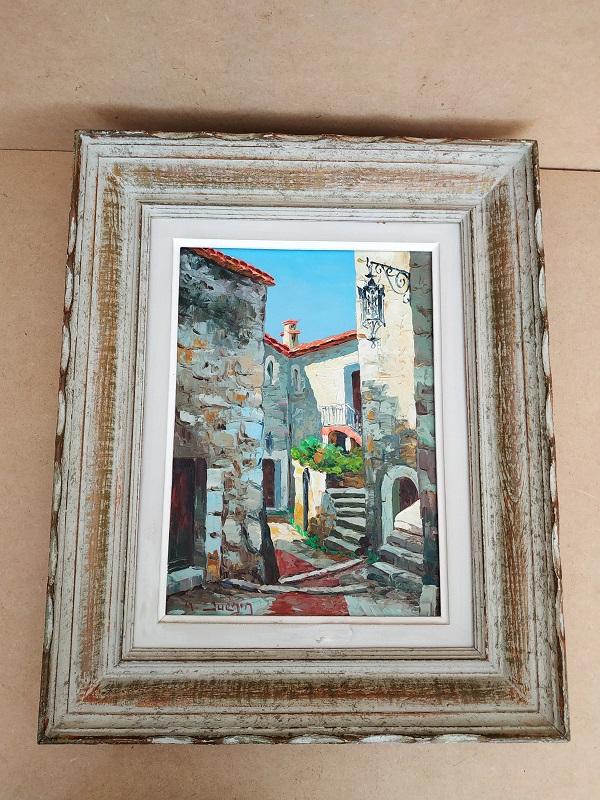 Huile sur toile représentant une ruelle de village signée en bas à gauche M.Juénin artiste peintre Niçois des années 60.