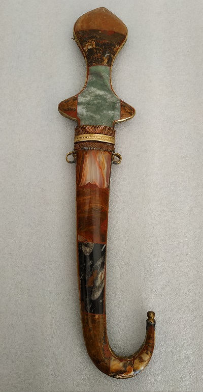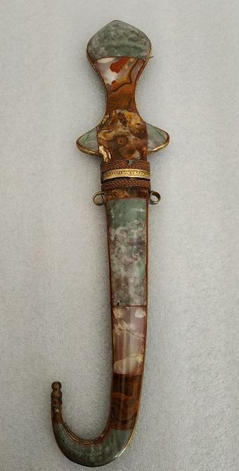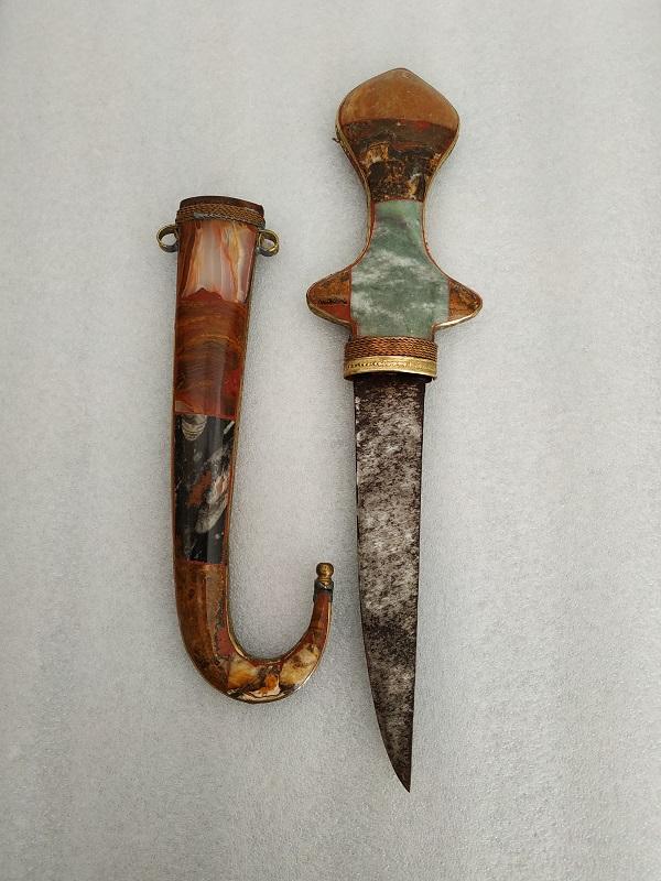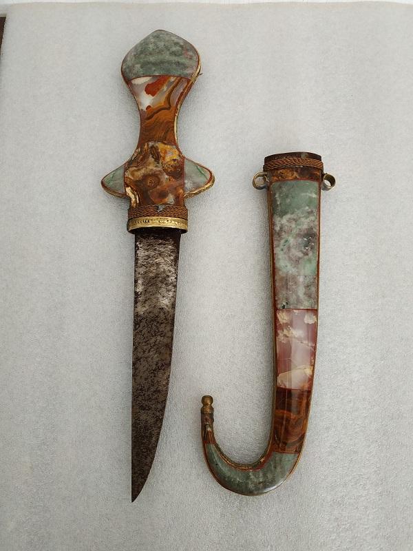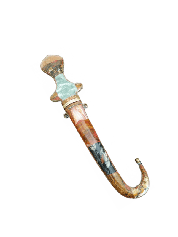 Poignard traditionnel des tabors marocains décoré de pierre polies onyx, marbre, quartz sur les deux faces du fourreau et du manche,lame en métal.