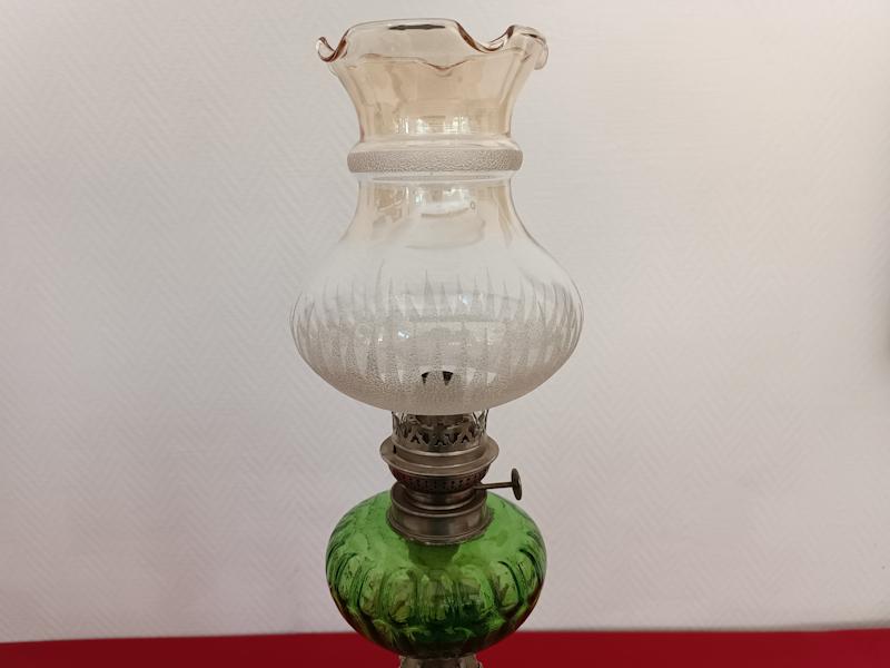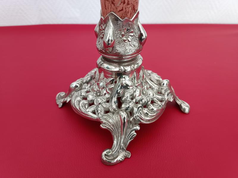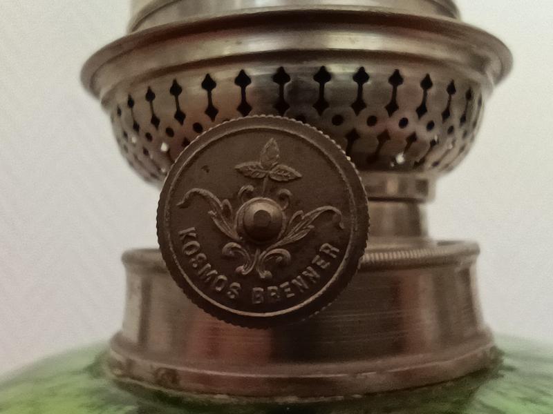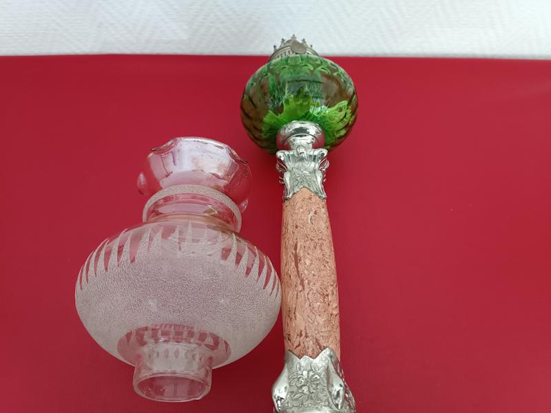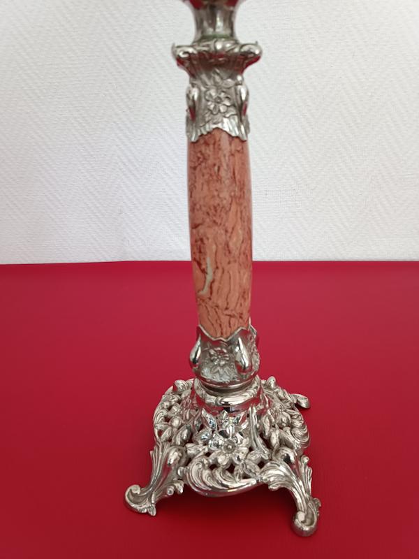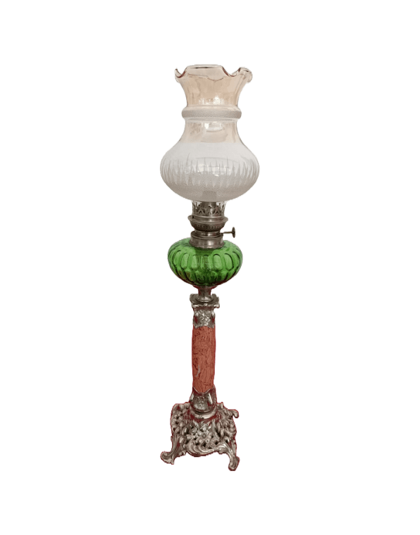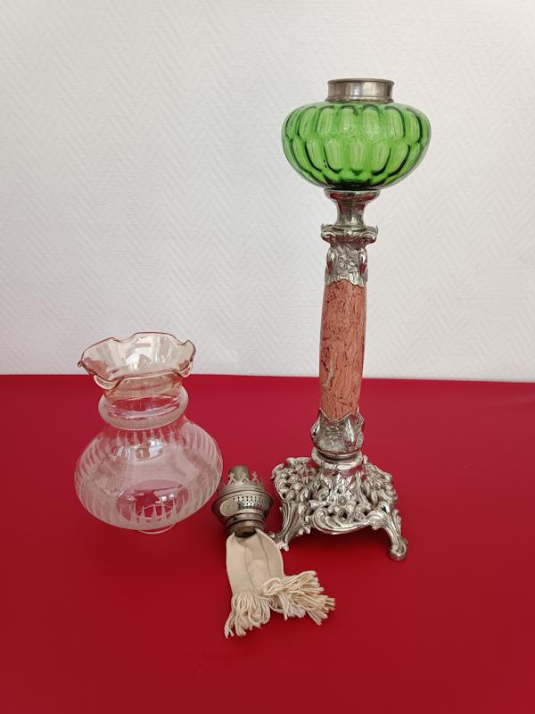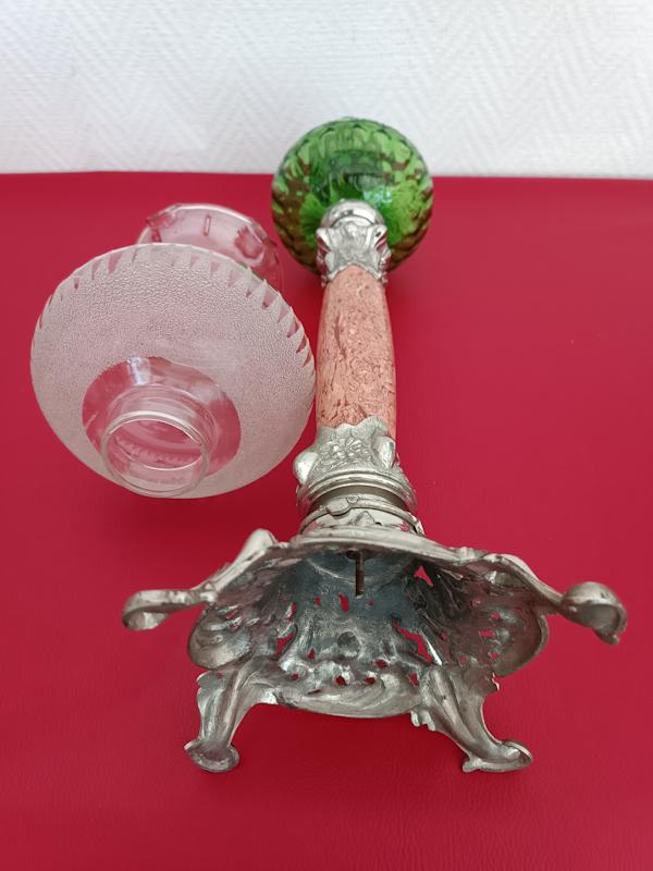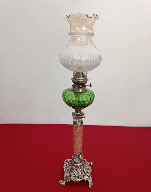 Lampe à pétrole Kosmos Brenner monture en régule argenté, fût en marbre rosé, réservoir et abat-jour en verre.