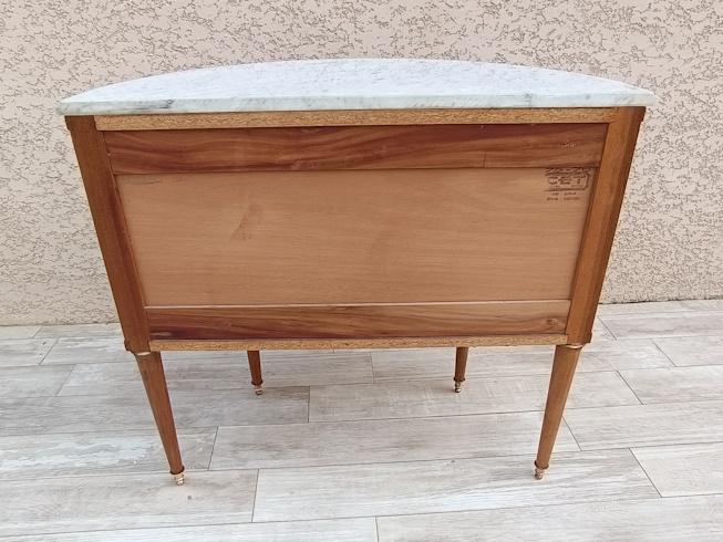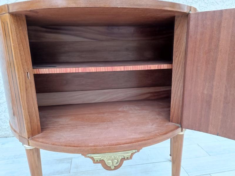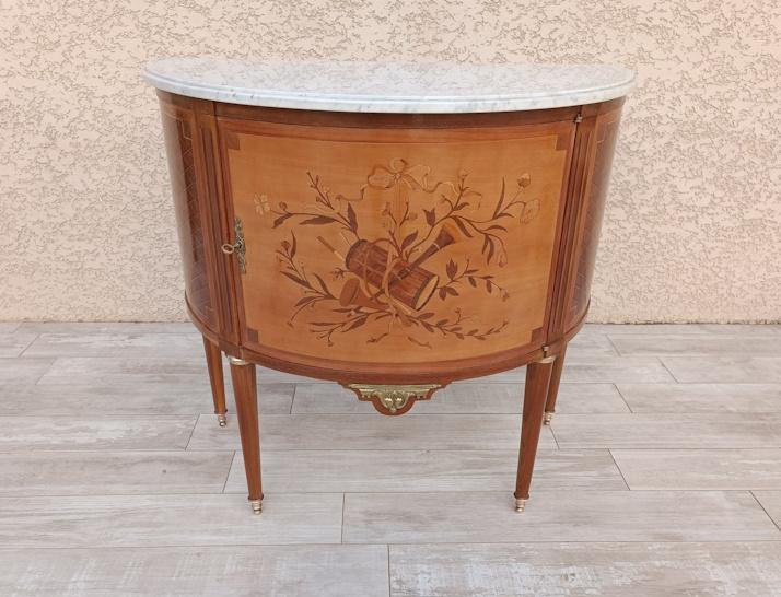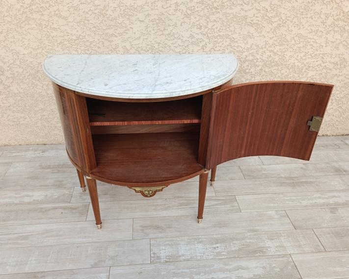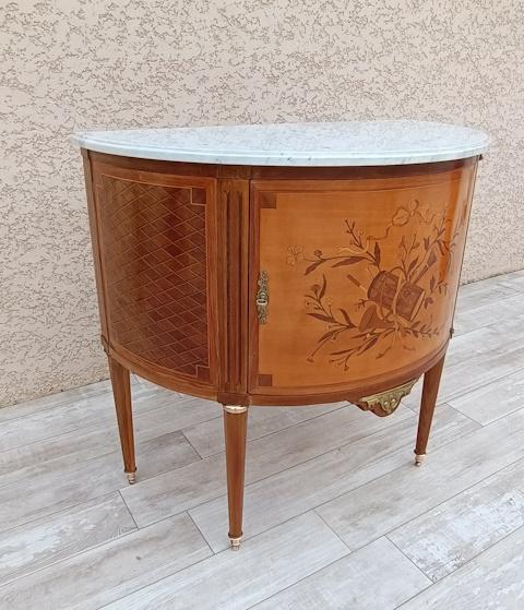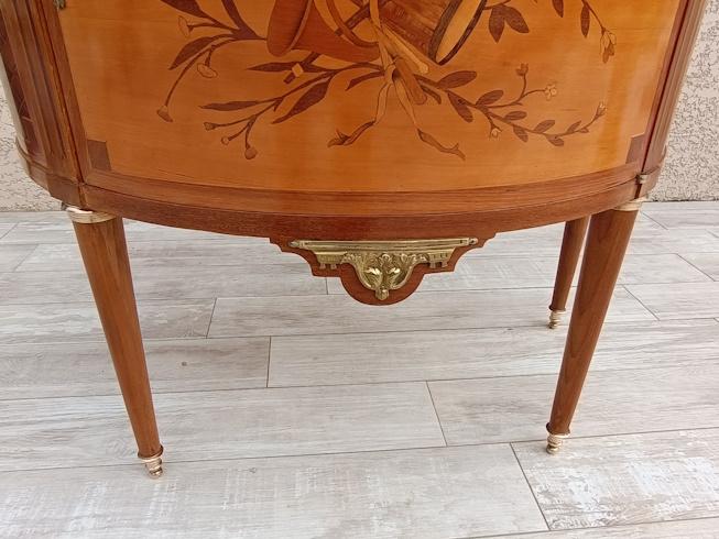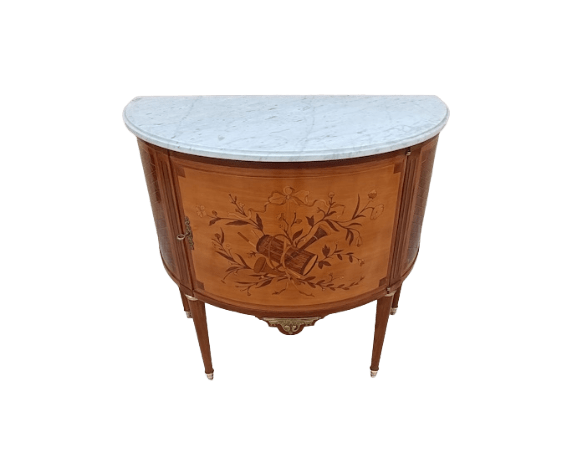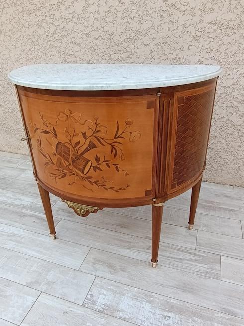 Meuble demi-Lune en marqueterie de placage et garnitures en bronze doré de style Louis XVI.