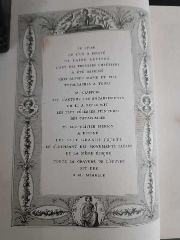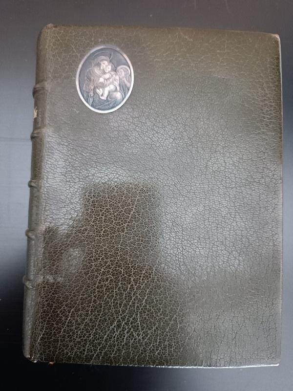 Missel « des Catacombes » N°75 daté du 05 mai 1895 monogrammé JC, couverture en cuir brun avec médaillon de la Madone della Seggiola en haut à gauche, les tranches sont dorées, reproductions des peintures de catacombes et dessins des monuments Sacrés par M.Ciappori et M.Merson.