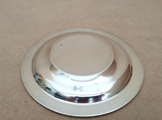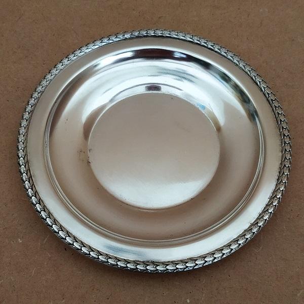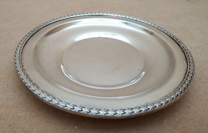 Ensemble moutardier couvert en cristal de Bavière avec sa cuillère en inox Solingen joint d’une soucoupe en métal argenté Ø 14cm. En bon état(traces d’usage). Dimensions: H9 x Ø10cm.Poids 460g