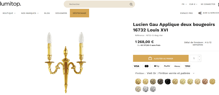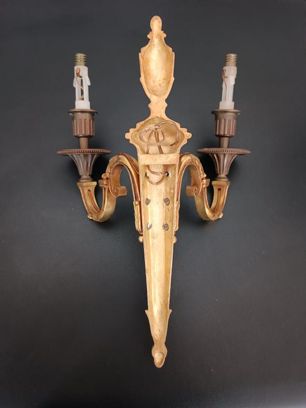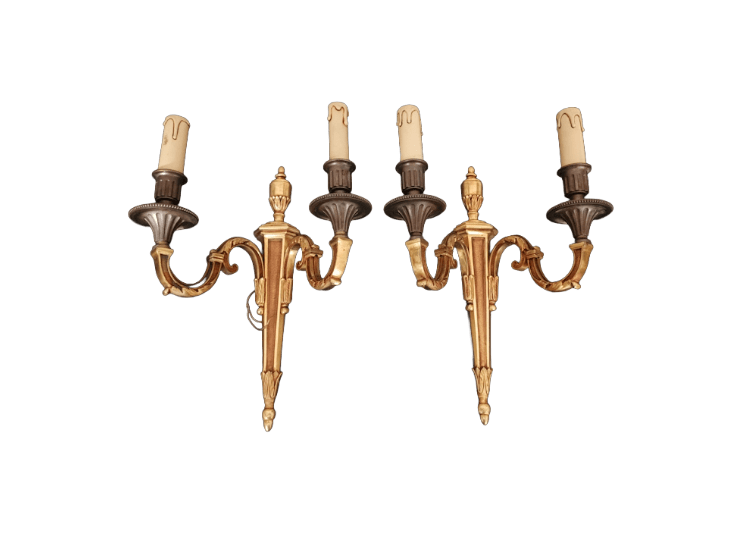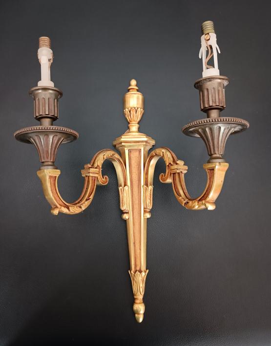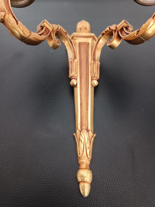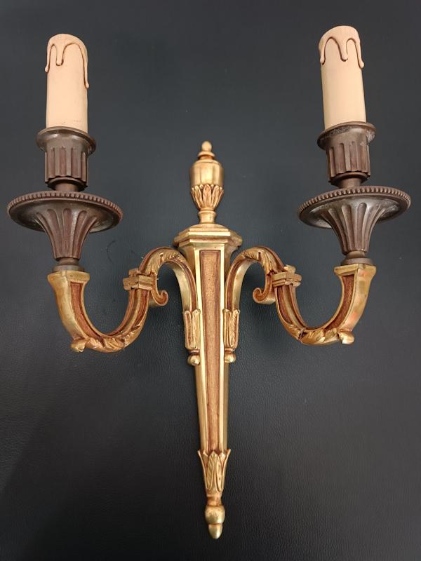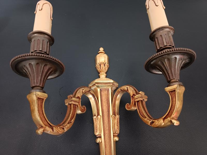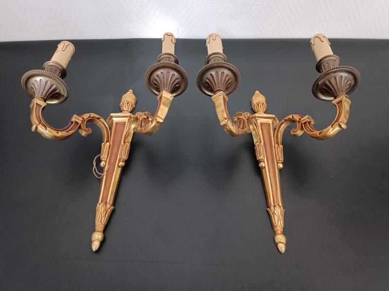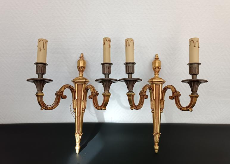 Paire d’appliques murales en bronze patine dorée et à deux bras de lumière de style Louis XVI à motifs de feuillages et de structures géométriques (au catalogue de Lucien Gau).