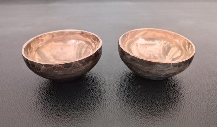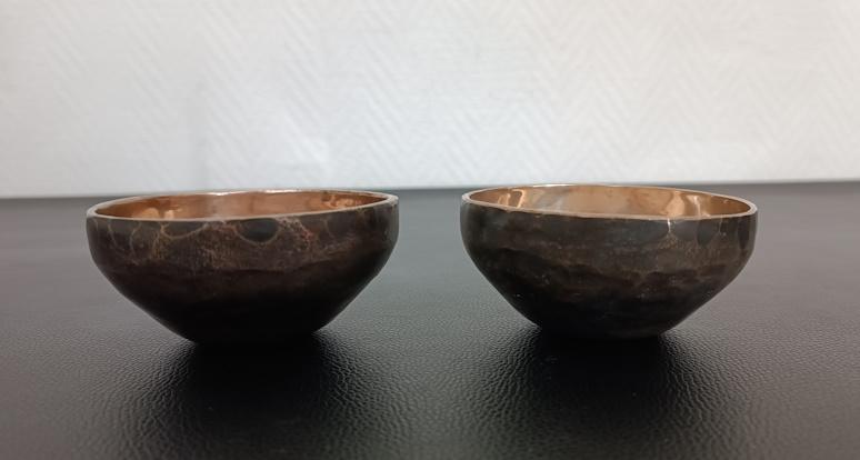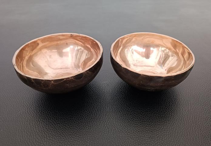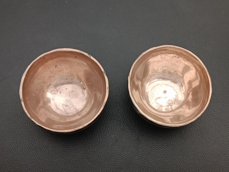 Paire de bols chantants en bronze martelé, intérieur poli. Travail artisanal généralement dans un alliage de 7 métaux.