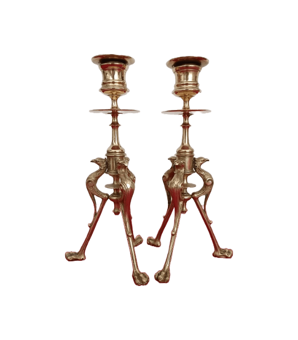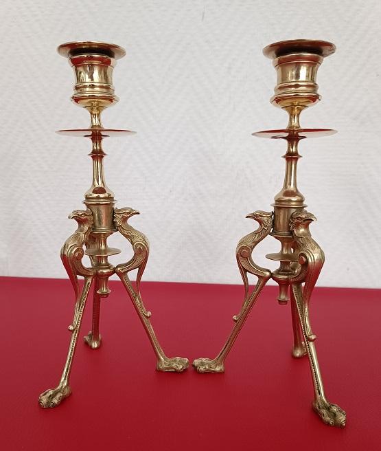 Paire de bougeoirs tripodes en bronze à décors de griffons