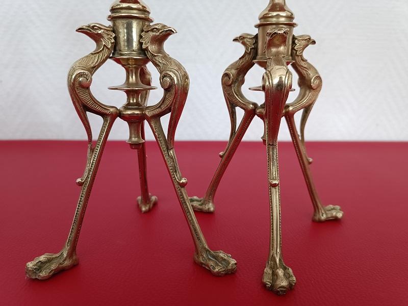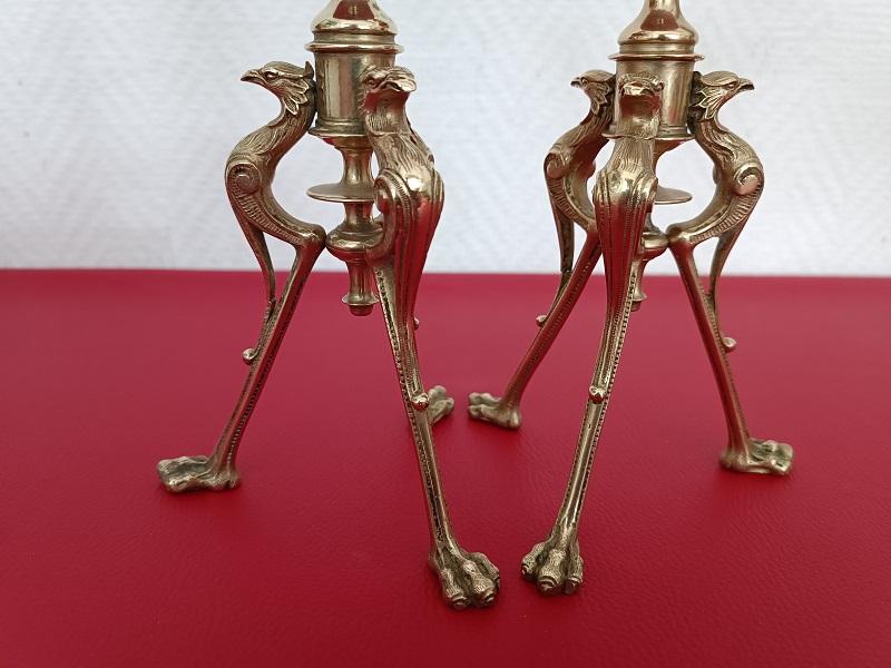 Paire de bougeoirs en bronze doré de style Empire à décor de griffons, pieds pattes de lion, période fin XIXème.