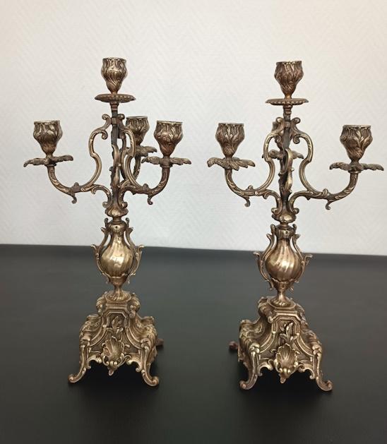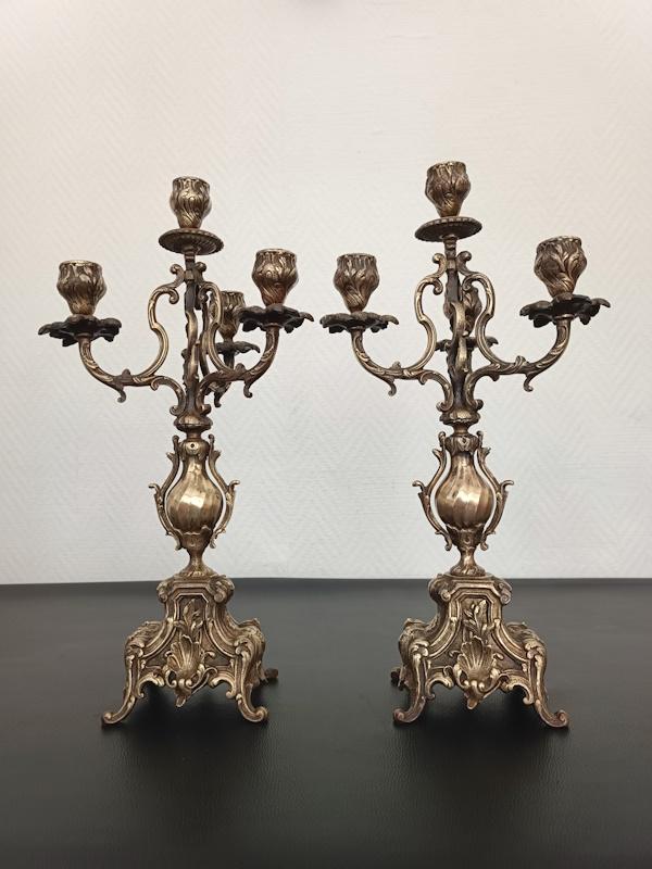 Paire de chandeliers en bronze patine dorée à 4 bougies, de style Louis XV décor Rocaille de volutes, de feuillages et de coquilles, période XIXème siècle.