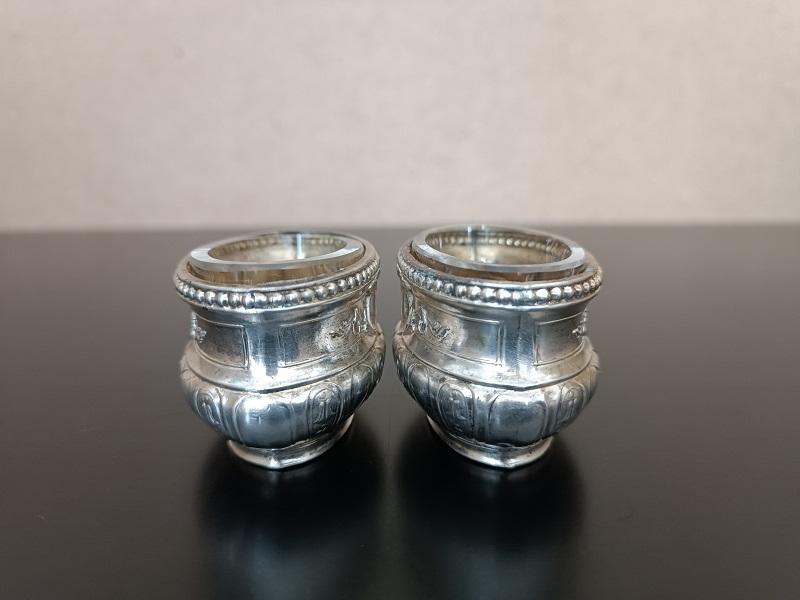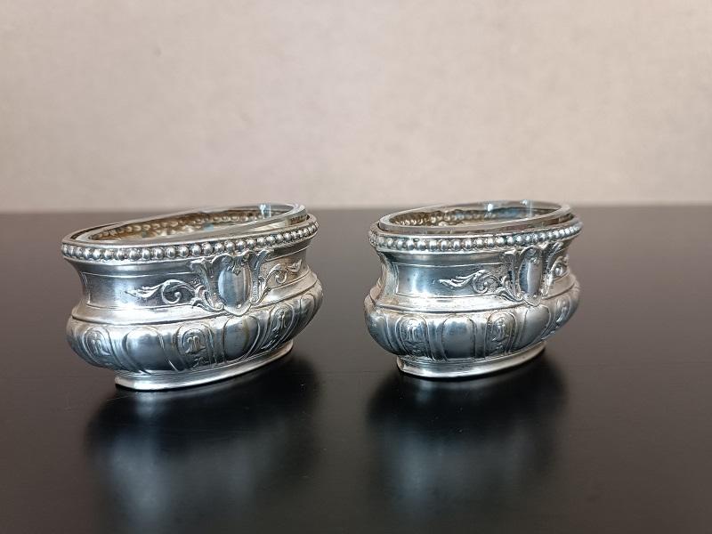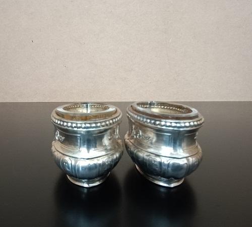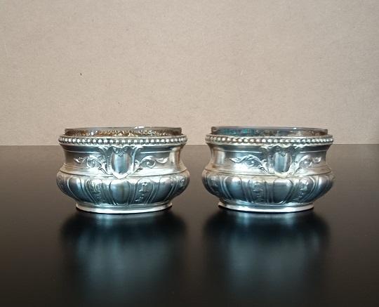 Paire de salerons en métal argenté et verre de style Louis XVI à décor de feuillage et frise de perles.