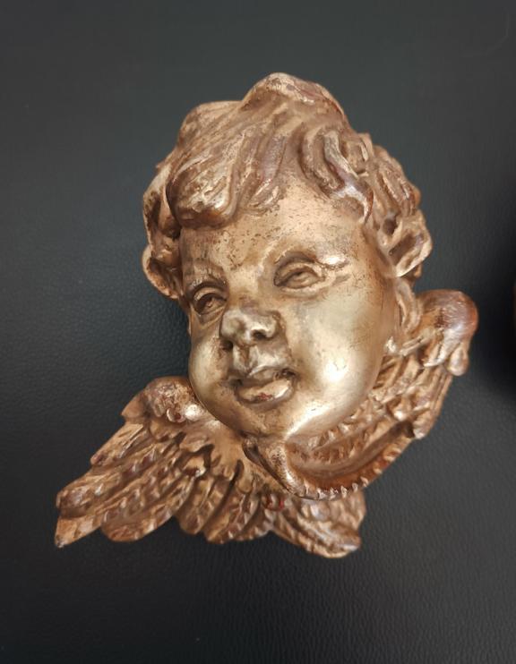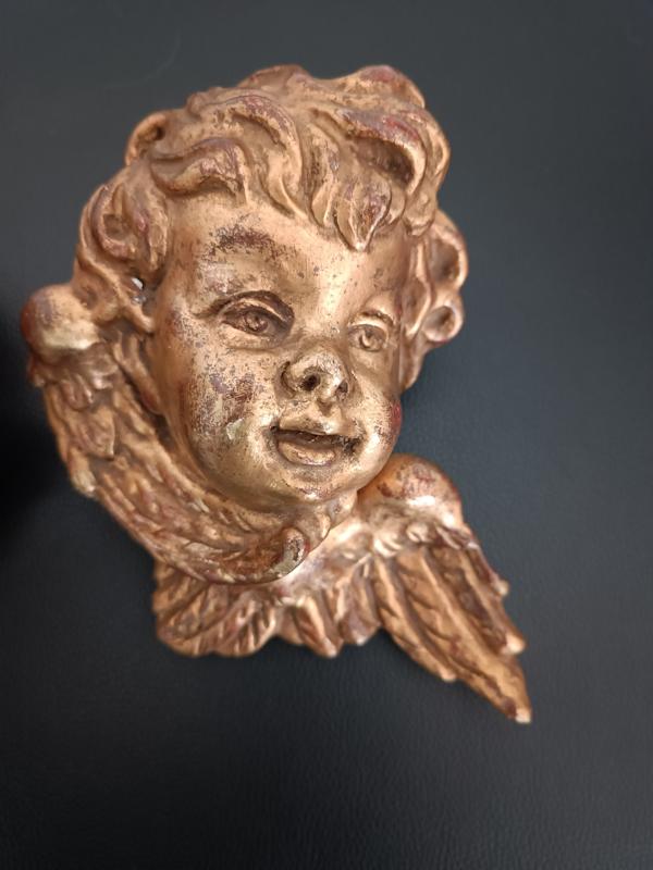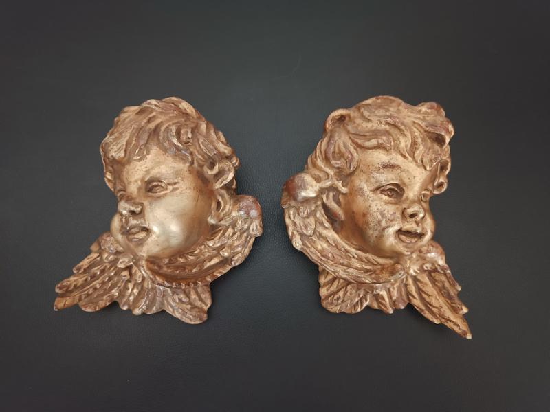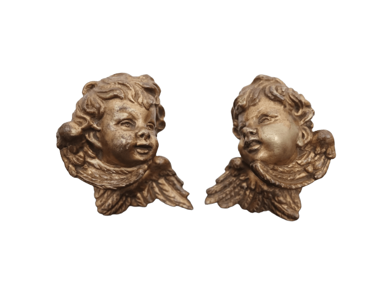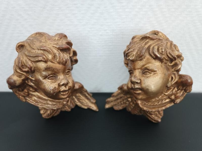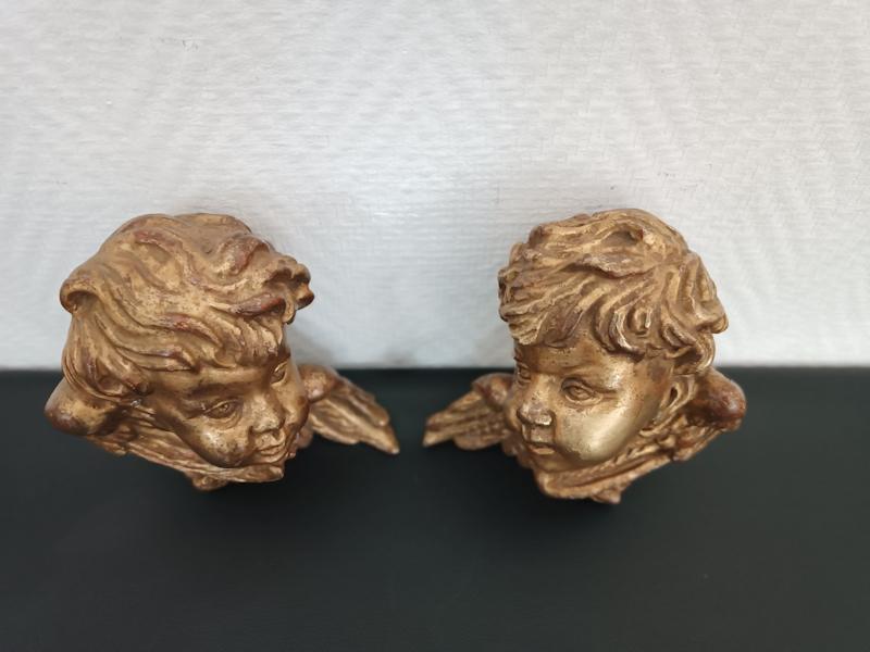 Paire de têtes de putti en plâtre patine dorée avec fixation murale au dos.