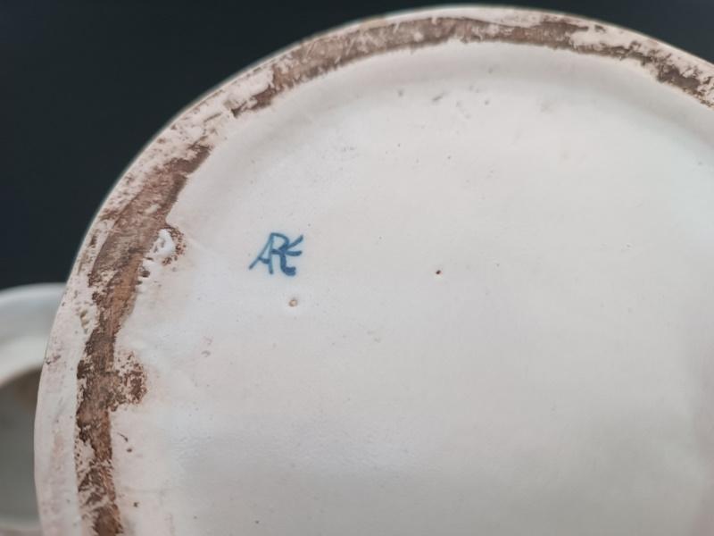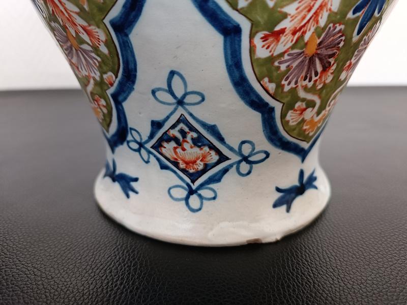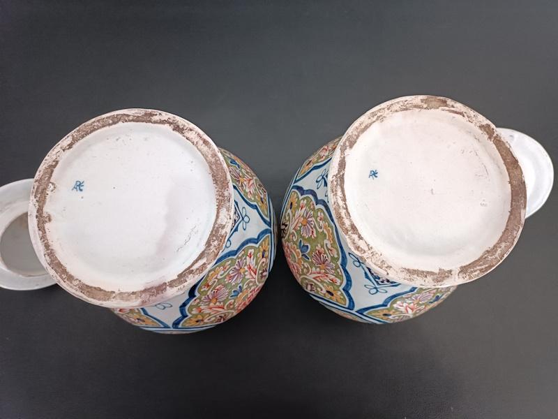 Paire de vases couverts en faïence polychrome à décor floral, cachet sous la base.
