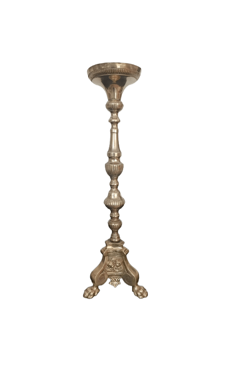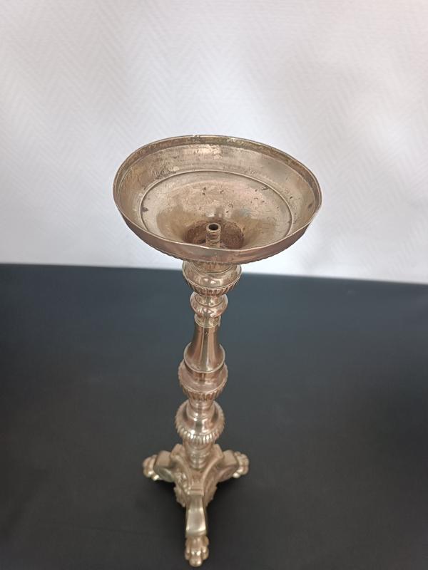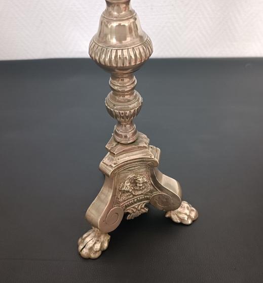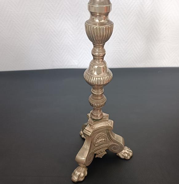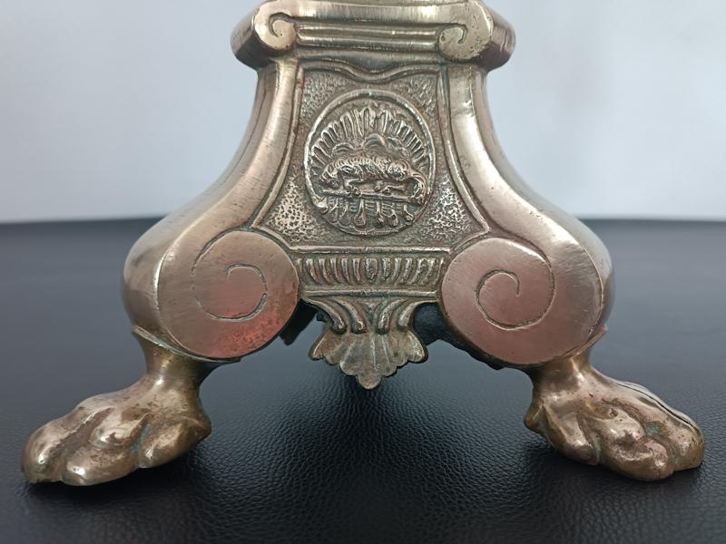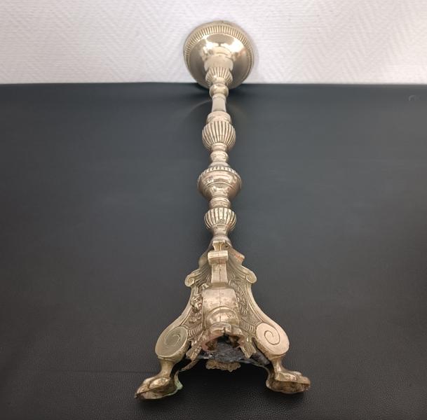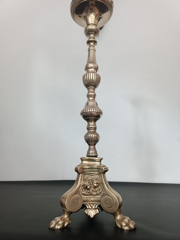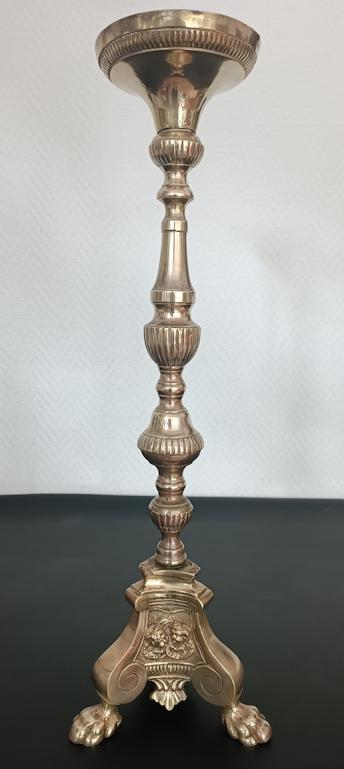 Pique-cierge en bronze doré tripode, fût balustre à décor de godrons, base triangulaire à piétement en forme de patte de lion orné de médaillons représentant des angelots et un agneau.