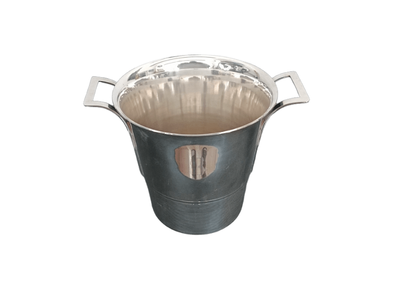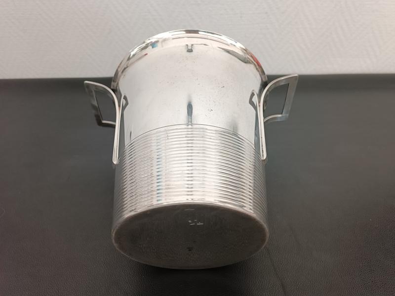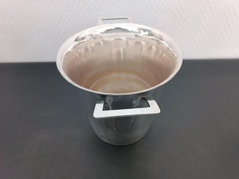 Seau à champagne en métal argenté au design Art Déco anses géométriques, base ronde striée sur 8cm de hauteur. Poinçon de l’orfèvrerie Deschamps Frères à Paris vers 1930.