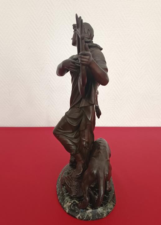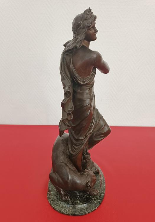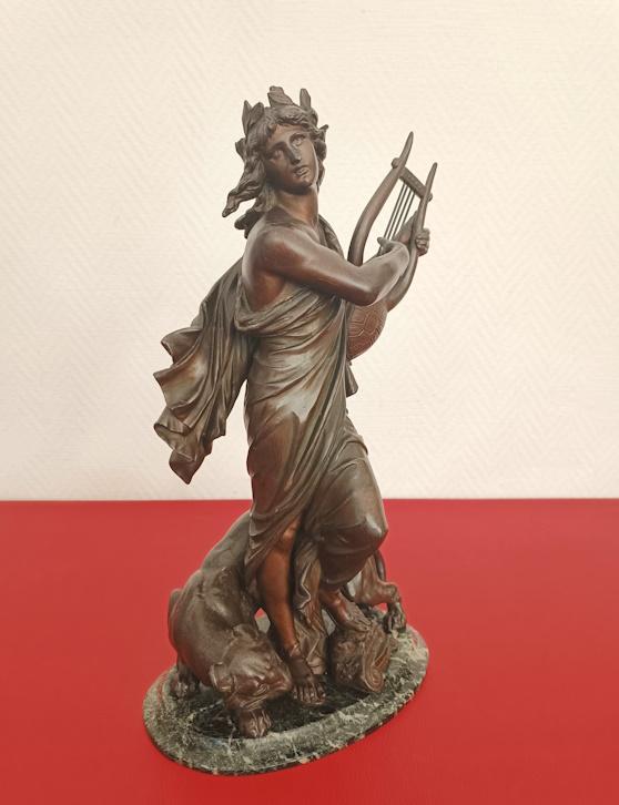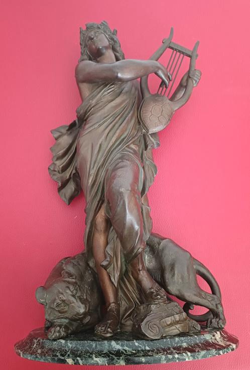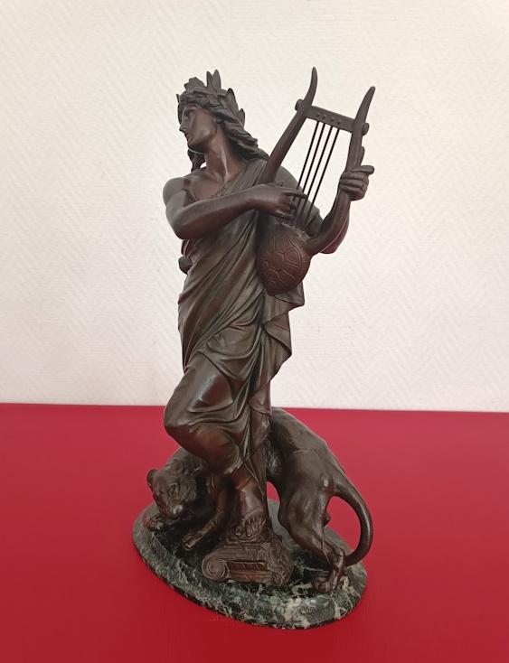 Selon la mythologie Grecque Orphée avait le don de charmer les animaux sauvages et parvenait à émouvoir les êtres inanimés. L’ensemble fixé sur un socle en marbre vert de mer. En bon état général, absence de signature. Dimensions: H44 x P15 x L25cm-Poids 5kg300. A récupérer sur place, région de Castelnaudary.