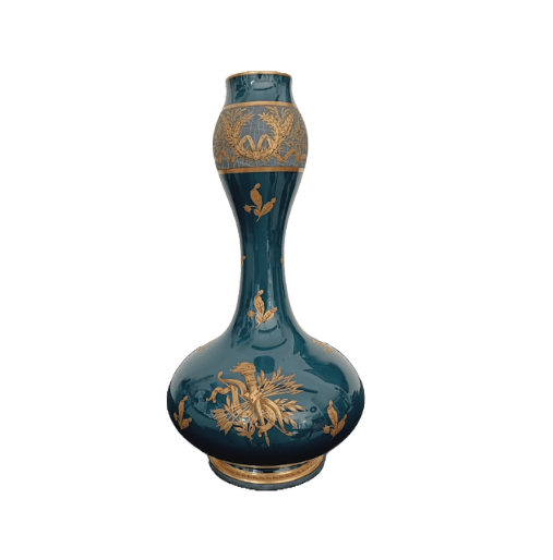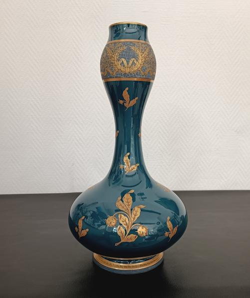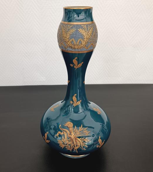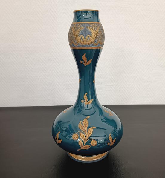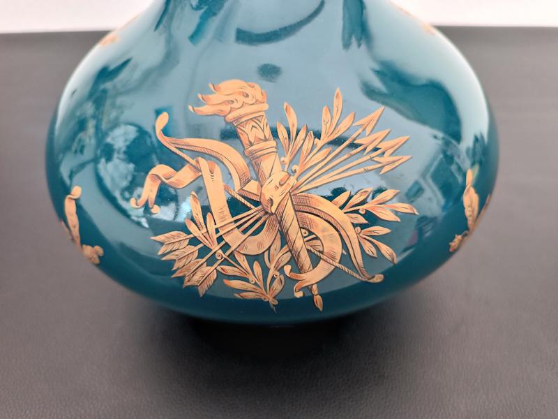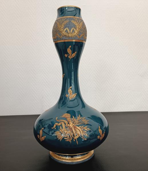 Vase à long col renflé orné de couronnes triomphales de lauriers, panse évasée à décors dorés d’un trophée au carquois et de végétaux sur fond bleu, l’ensemble reposant sur un base surélevée.