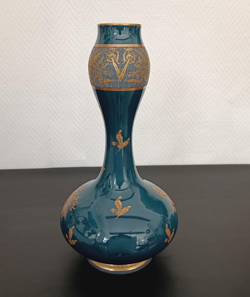 Signature sous la base JP France pour la manufacture Janet et Pinon de Tours. En bon état général, aucun éclat ni fêle. Hauteur 46cm x Ø 14cm(base)-Panse 24cm-Poids 3kg800.